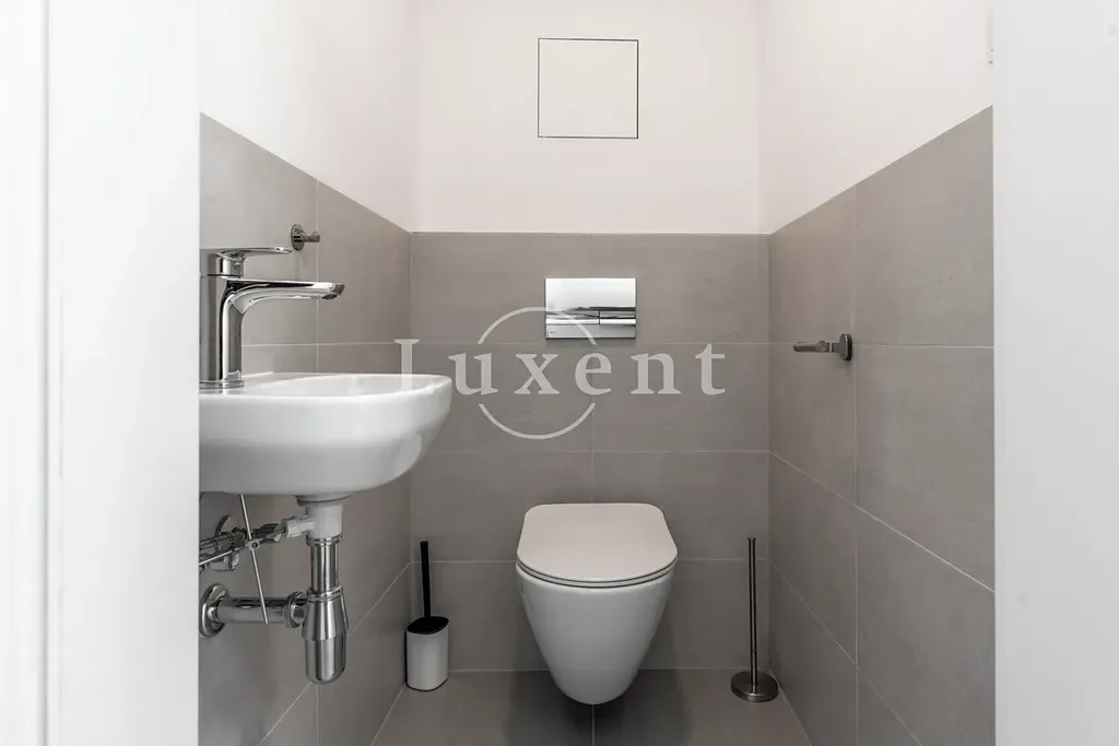 Dispozice zahrnují prostornou obývací místnost s moderním kuchyňským koutem na míru, ložnici, pracovnu či dětský pokoj, vstupní chodbu, koupelnu s vanou, oddělenou toaletu a technickou místnost s pračkou a sušičkou.