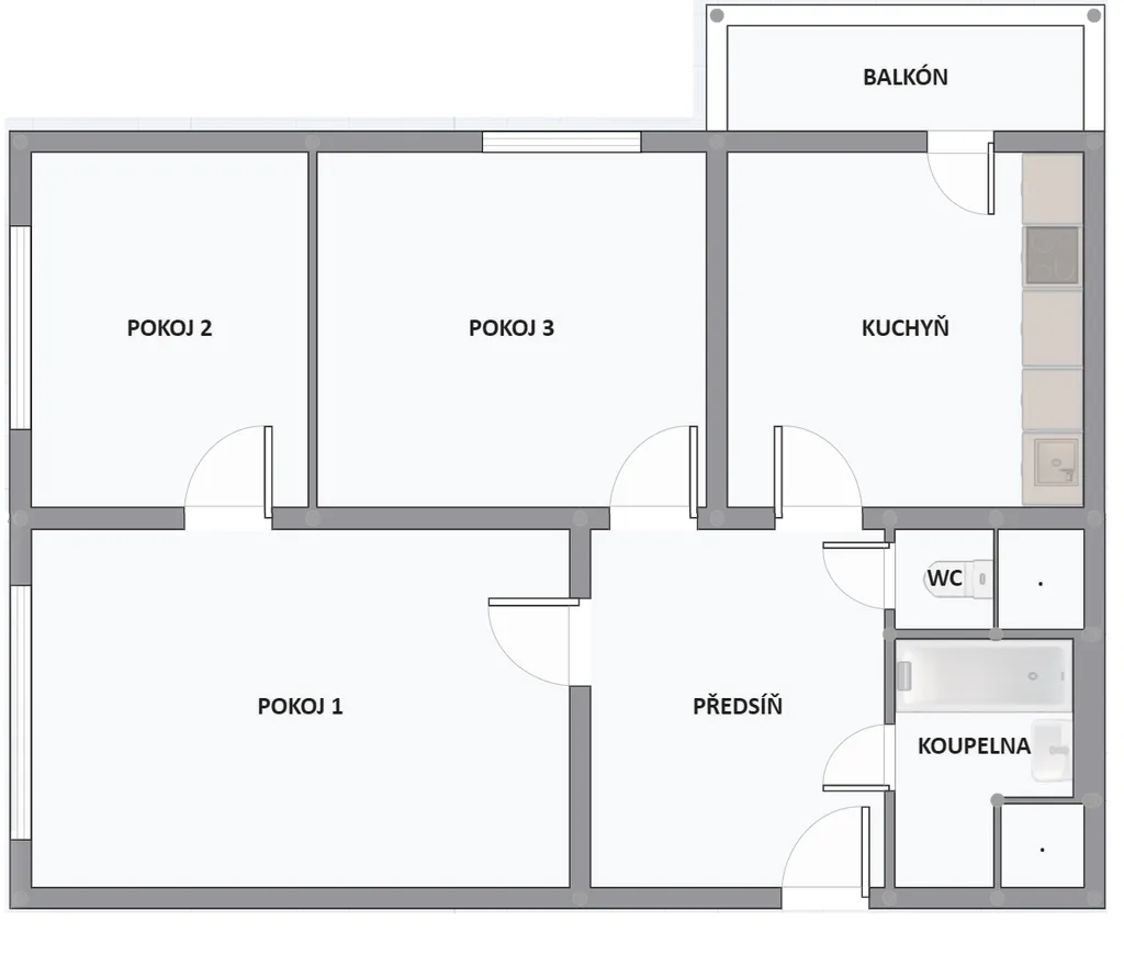 Dispozičně byt nabízí prostornou čtvercovou kuchyni se vstupem na lodžii, navazující obývací pokoj a dvě samostatné neprůchozí místnosti. Výhodou je také velká předsíň s potenciálem pro vestavěné skříně a dostatek úložného prostoru.