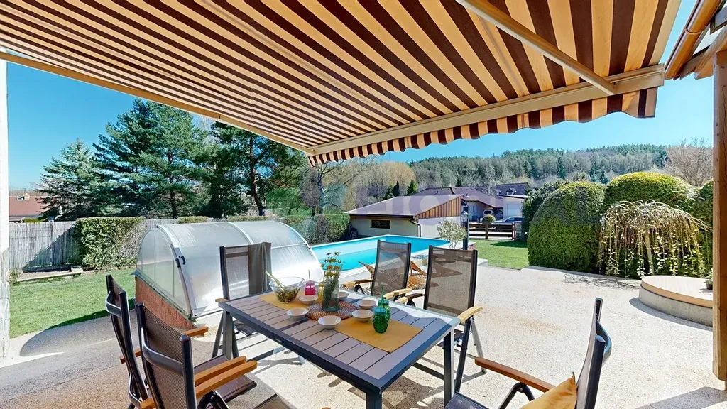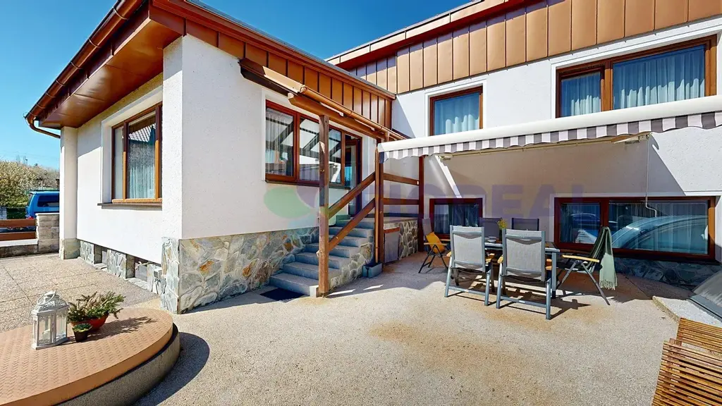 Terasa s markýzou je ideální pro rodinné posezení a stolování.