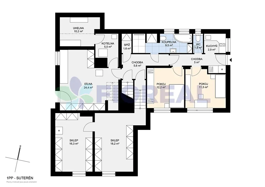 Suterén disponuje velkorysými prostory zahrnujícími dílnu a sklepy s přístupem denního světla, které uspokojí každého kutila.