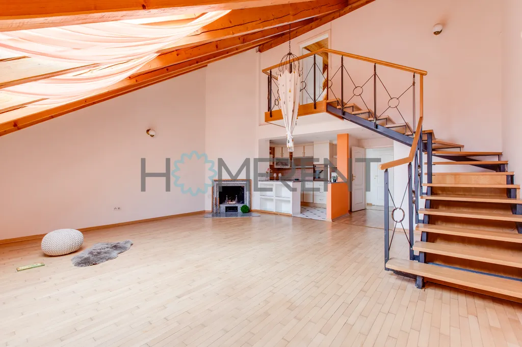 Dominantou bytu je velký otevřený obytný prostor s kuchyní, schodištěm, krbem a velkými okny, která zajišťují dostatek denního světla a dodávají interiéru vzdušnost a osobitý charakter. Prostor působí velmi příjemně, elegantně a zároveň útulně. Kuchyň je plně vybavená a připravená k okamžitému používání, takže poskytuje plnohodnotné zázemí pro každodenní život i příjemné posezení.