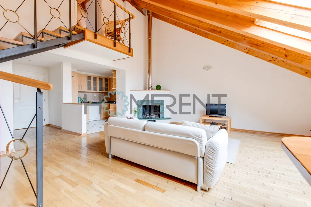 Dominantou bytu je velký otevřený obytný prostor s kuchyní, schodištěm, krbem a velkými okny, která zajišťují dostatek denního světla a dodávají interiéru vzdušnost a osobitý charakter. Prostor působí velmi příjemně, elegantně a zároveň útulně. Kuchyň je plně vybavená a připravená k okamžitému používání, takže poskytuje plnohodnotné zázemí pro každodenní život i příjemné posezení.