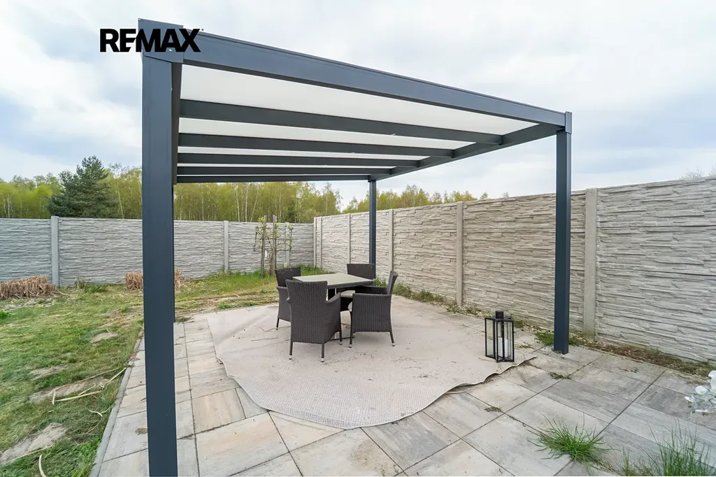 Na zahradě se nachází také stylová pergola ve stejném designu, která nabízí další příjemné místo pro posezení nebo relaxaci.