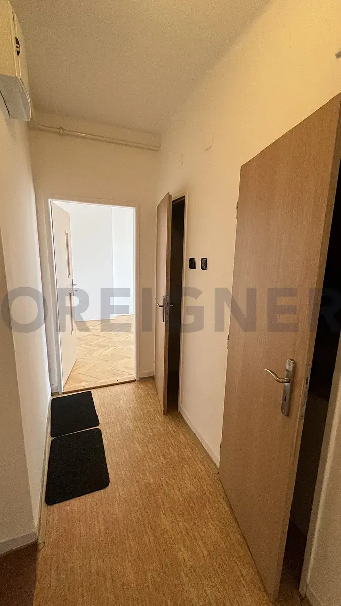Po příchodu do bytu se nachází dva částečně vybavené pokoje. Rozdělení pokojů záleží na společné domluvě nynějším zájemcem bytu. V chodbě do kuchyně nalezneme botník se zrcadlem a věšákem, v hlavní chodbě koupelnu s vanou a oddělenou toaletou. Přes chodbu se poté vchází do kuchyně a po pravé straně do samostatného pokoje. Po levé straně z hlavní chodby se vchází do druhého samostatného pokoje.