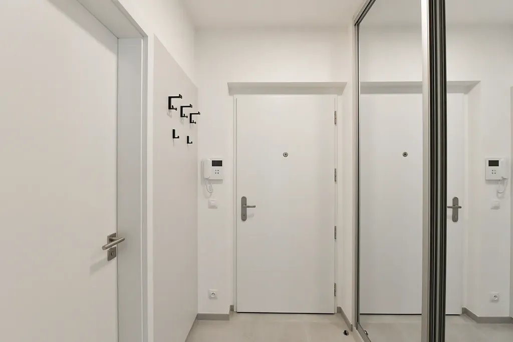 Byt nabízí vstup se skříněmi a věšáky, obývací pokoj vybavený kuchyňskou linkou se spotřebiči AEG, ložnicí s vestavěnými skříněmi, komoru, koupelnu s vanou a samostatné WC.