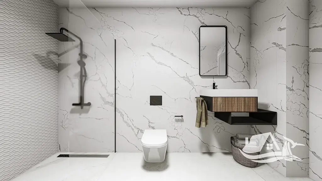 Interiér kombinuje moderní design s praktickými prvky pro každodenní život. Podlahy z porcelánové dlažby zajišťují elegantní vzhled a snadnou údržbu, vestavěné skříně poskytují dostatek úložného prostoru a plně vybavená kuchyně se spotřebiči včetně vinotéky umožňuje okamžité užívání domu. Komfort zvyšují moderní technologie, mezi které patří domácí automatizace, elektrické rolety, videotelefon, LED osvětlení v interiéru i exteriéru a předinstalace klimatizace. Součástí je také řízené větrání, kvalitní PVC okna s nízkou emisivitou a plně vybavené koupelny s moderním designem.