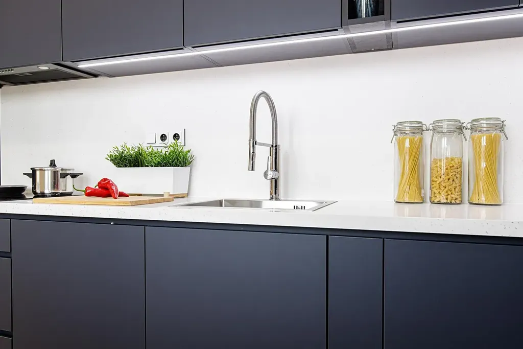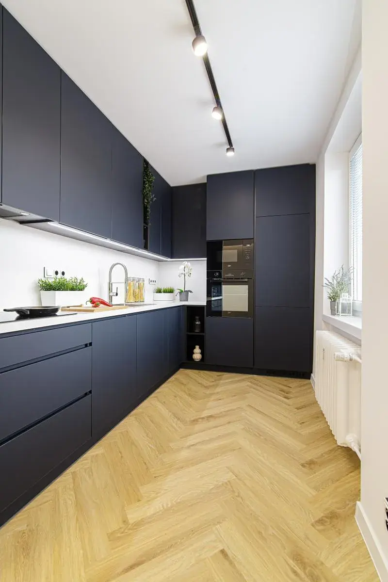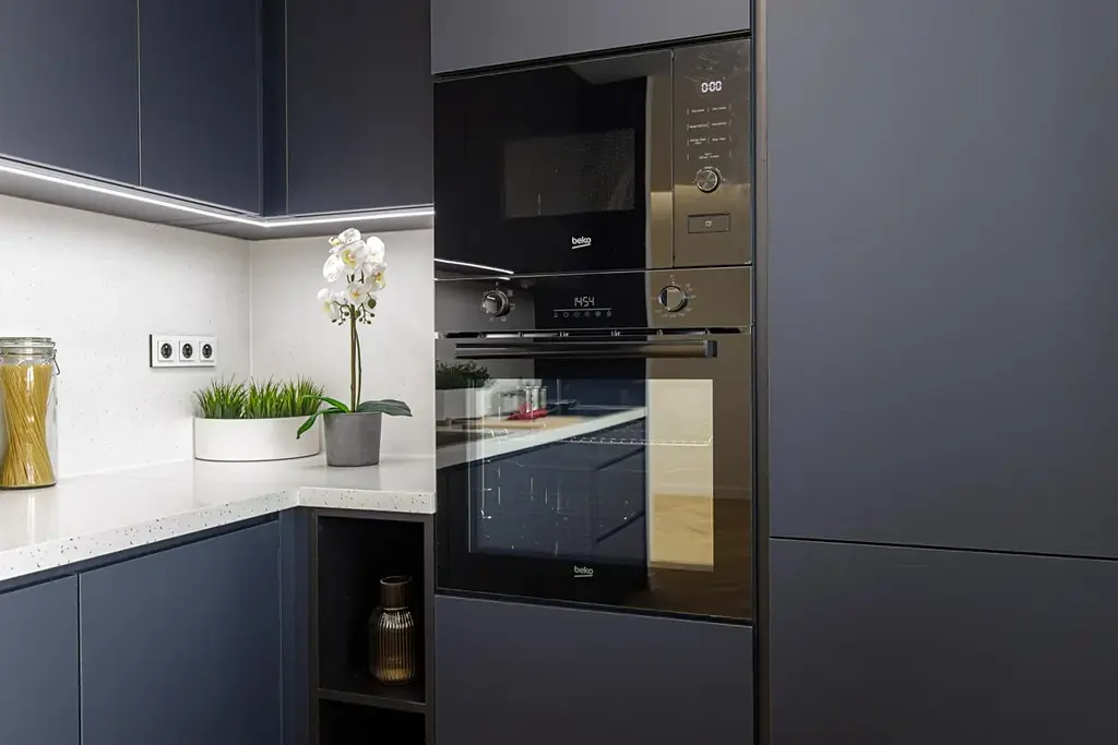 - Kuchyňská linka na míru včetně vestavných spotřebičů: lednice, myčka, digestoř, elektrická trouba, mikrovlná trouba, indukční varná deska, LED podsvícení