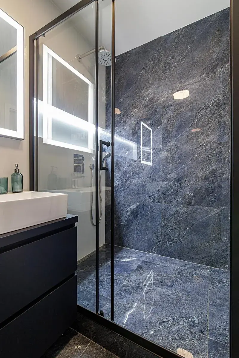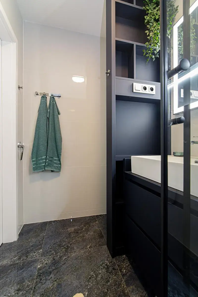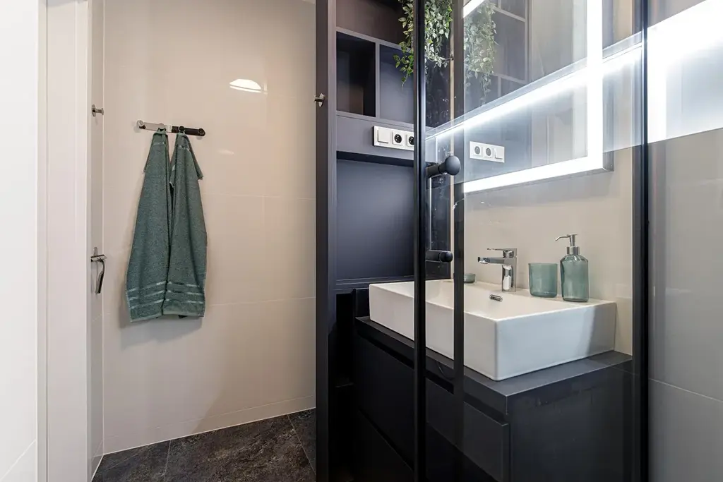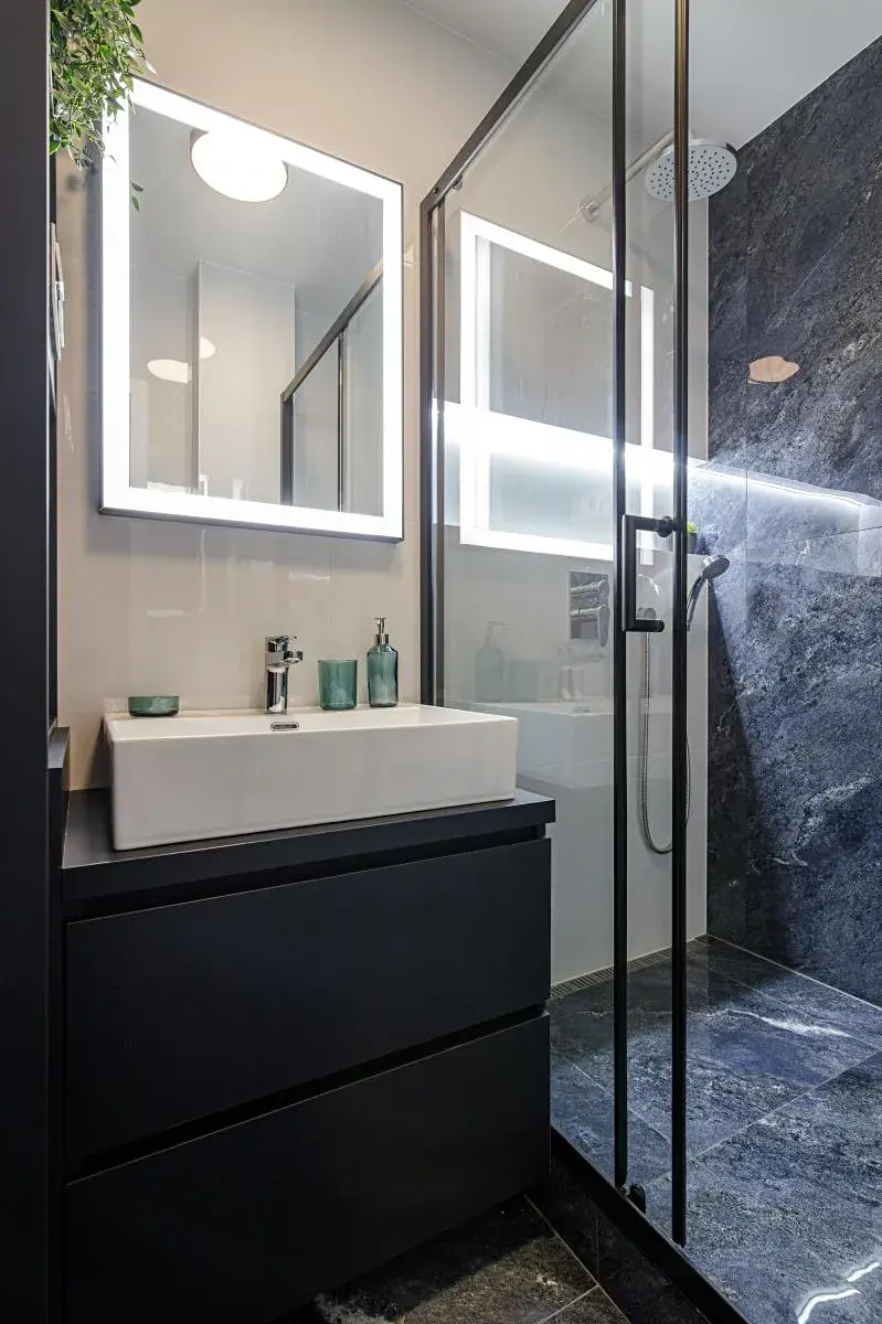- Koupelna se sprchovým koutem, novými obklady, umyvadlem se skříňkou, podsvíceným zrcadlem a moderními bateriemi