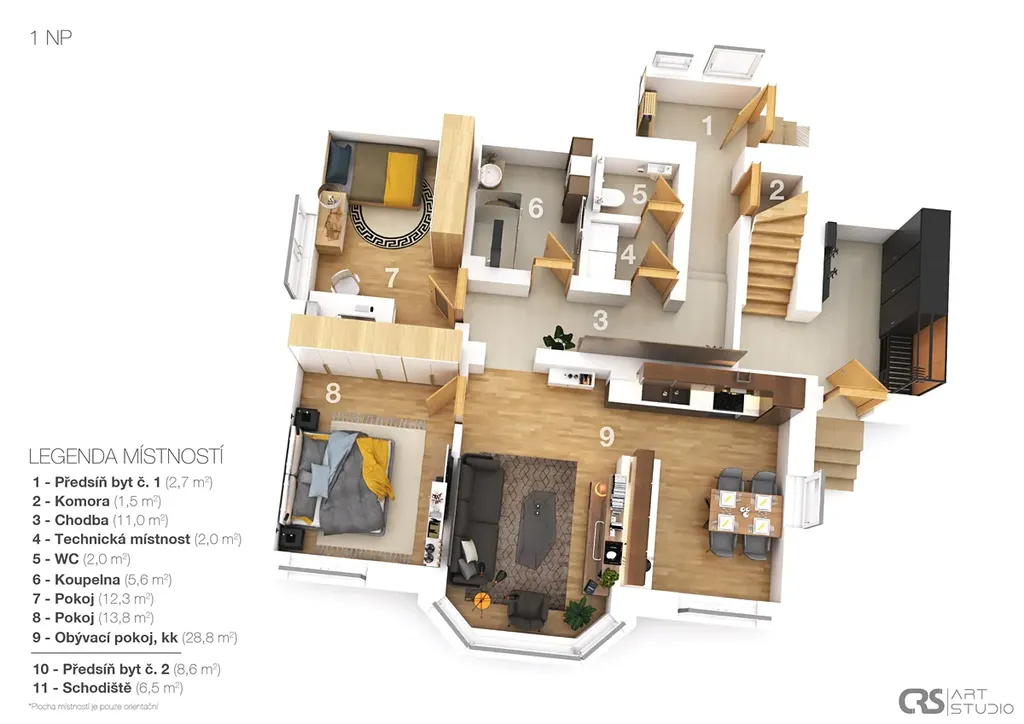 Dům má celkovou obytnou plochu 178 m² a užitkovou plochu 211 m², která je rozložena mezi dvěma nadzemními patry a jedním podzemním podlažím. Dle vytvořené studie a stavebního projektu lze dům přestavět na dvě samostatná bytové jednotky s dispozicí 3+kk, kdy byt ve 2.NP disponuje balkonem a menším podkroví. Obě bytové jednotky budou mít svoje vlastní, oddělené a samostatně přístupné sklepní prostory. Spodní byt v přízemí nabízí potom 78,2 m² užitné plochy a byt ve druhém podlaží potom 87 m². Oba byty počítají s vlastním vstupem, a tedy jsou absolutně na sobě nezávislé. Díky tomu je dům a byty ideální pro rodiny hledající prostor a soukromí. Nicméně lze zachovat aktuální společné prostory a pak může být dům kompletně vícegenerační a nabízet více společných prostor pro rodiny. V současné stavu je dům určen k rekonstrukci, což představuje skvělou příležitost přizpůsobit interiér podle vlastních představ a potřeb, kdy se projekt může změnit dle představ nových majitelů. Po vybudování samostatných bytů lze využít jako investiční příležitost se ziskem z pronájmů.