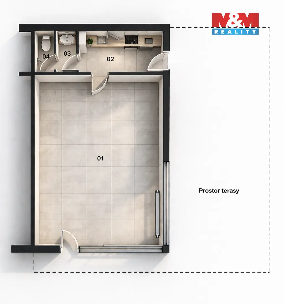 Součástí prostoru je kuchyňka, skládek a toaleta, možnost i využití venkovní terasy.