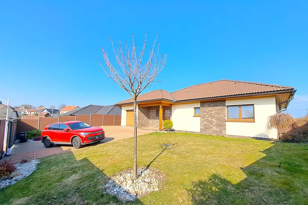 Dispoziční řešení domu: Zádveří, vstupní chodba, technická místnost, komora, kuchyň Sýkora s vestavěnými spotřebiči AEG , obývací pokoj s krbem a přímým vstupem do zahrady , pokoj-šatna se vstupem na prostornou terasu s příjemným posezením, ložnice, pokoj, koupelna ( umyvadlo, prostorným sprchový kout, finská sauna), samostatné WC s umyvadlem, garáž je opatřena sekčními vraty a přes technickou místnost se projde do domu. Vytápěná plocha domu je 120 m2.
