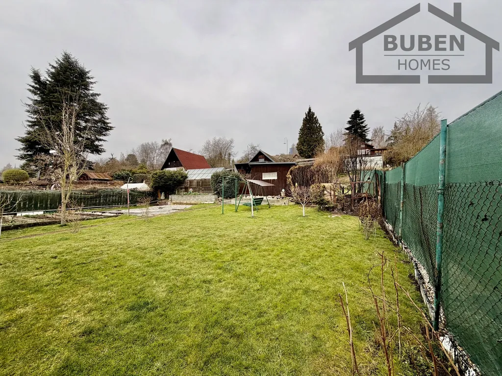 Hlavní plocha zahrady je rovinatá a pozemek je kompletně oplocen. Na slunné zahradě se nachází několik ovocných stromů a keřů, je zde zahradní jezírko a nádrž na jímání povrchové vody, ze které lze vodu přečerpávat do nádrže a užívat jako užitkovou (rozvody a čerpadlo součástí prodeje). V ceně je kompletní vybavení zahrady a chaty včetně nábytku, nářadí a zahradní techniky. K zahradě vede zpevněná příjezdová komunikace.