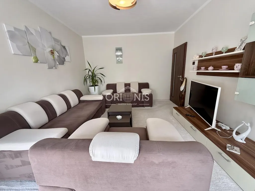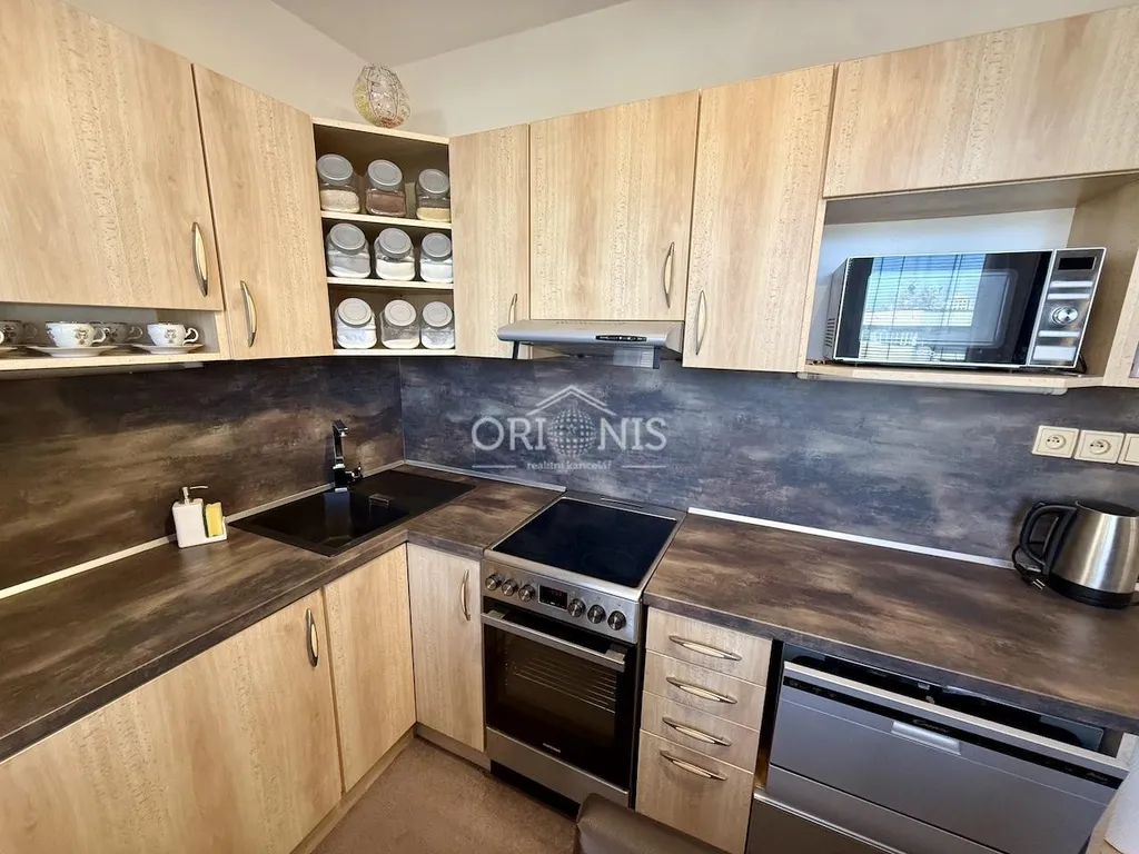 Dominantou bytu je vzdušný obývací pokoj, který spolu s dalším pokojem disponuje venkovními roletami zajišťujícími maximální komfort, soukromí i regulaci světla. Kuchyňská část je plně vybavena spotřebiči včetně myčky, lednice a pračky, doplněna o jídelní prostor pro společné chvíle s rodinou.