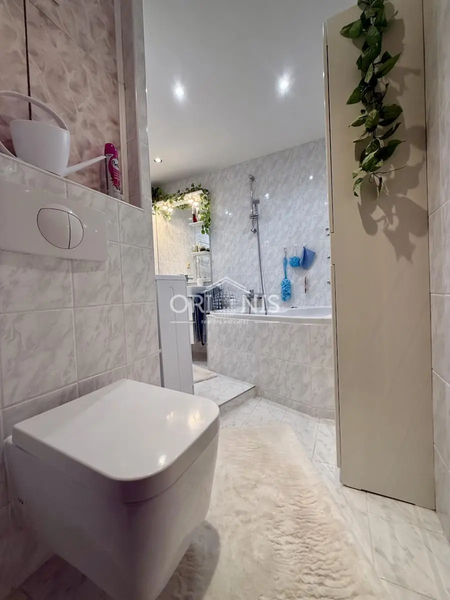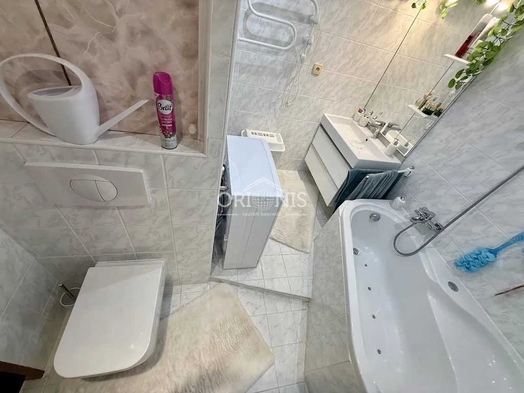 Koupelna nabízí kombinaci relaxace i praktičnosti. K dispozici je masážní vana i samostatný sprchový kout. Zděné bytové jádro podtrhuje kvalitu celé rekonstrukce.