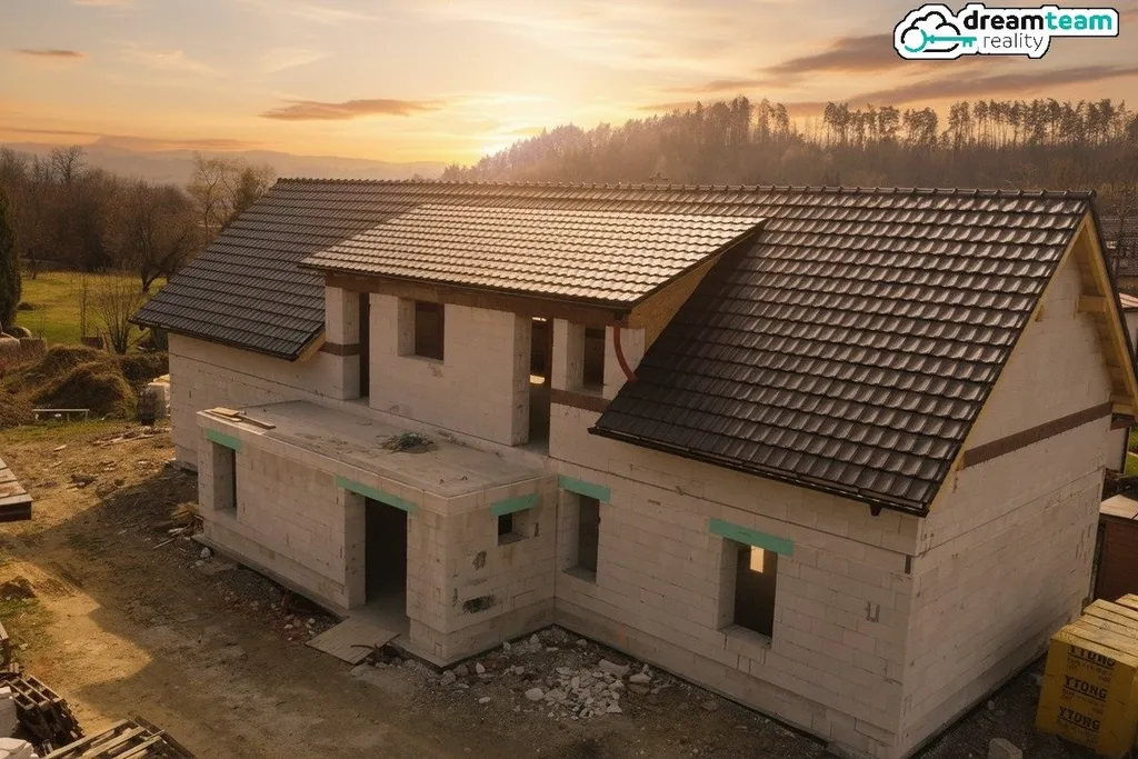 Hrubá stavba stojí pevně — solidní zdivo, nosníkový strop, sedlová střecha s černými pálenými taškami. Projekt je připraven pro tepelné čerpadlo vzduch-voda, podlahové vytápění a krbová kamna s výměníkem. Okna, fasáda, příčky, podlahy — to vše si navrhnete přesně podle svého. Máme připravenu konkrétní kalkulaci nákladů na dokončení i podporu při financování. Zavolejte mi — projdeme to spolu na prohlídce.