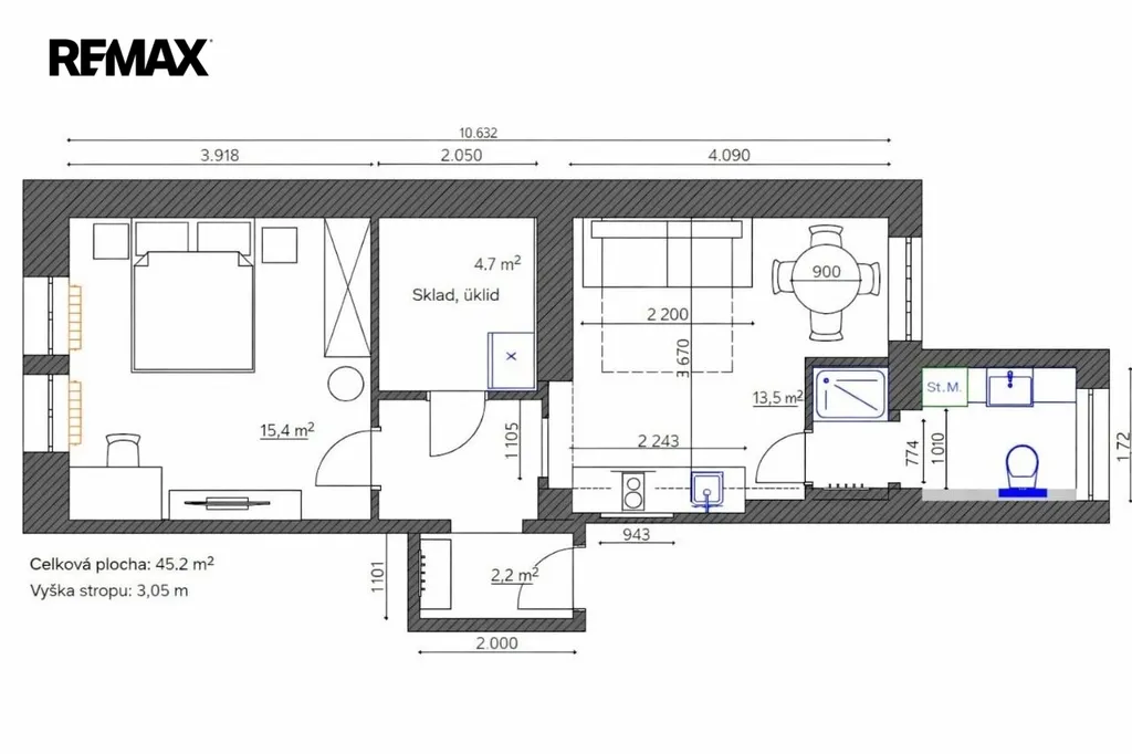 Byt se nachází ve 2. patře (3. NP) a jeho hlavní předností jsou vysoké stropy 3,05 m,