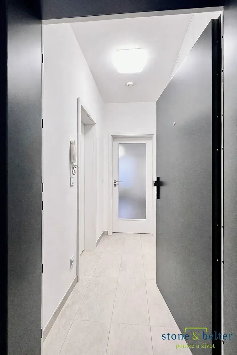 Dále je k dispozici předsíň (cca 4,0 m²) s vestavěnými skříněmi a dostatkem úložného prostoru. Koupelna (cca 4,6 m²) je vybavena vanou, toaletou, umyvadlem se zrcadlovou skříňkou a pračkou.