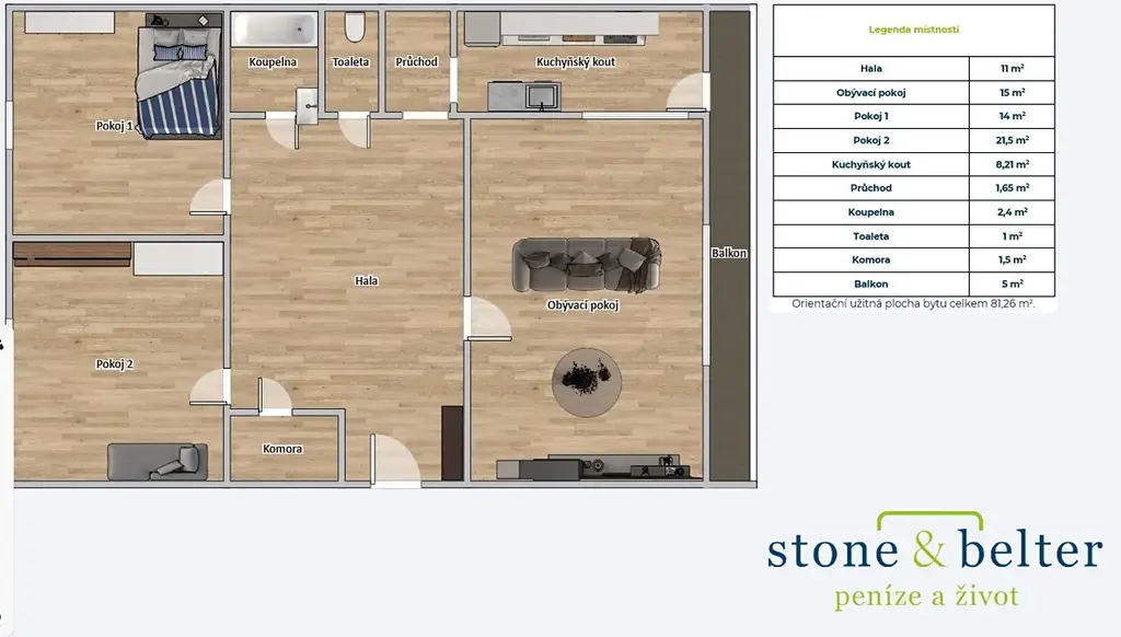 Celková podlahová plocha bytu činí cca 77,84 m² , k bytu náleží balkon o velikosti cca 5 m² a sklepní kóje cca 2 m². Byt je orientován na východ a západ, což zajišťuje příjemné prosvětlení v průběhu celého dne.