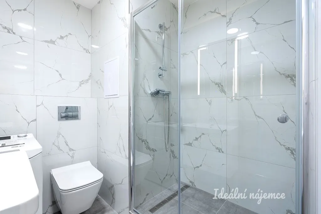 V koupelně se nachází sprchový kout, umyvadlo, koupelnová skříňka, zrcadlo, pračka a WC.