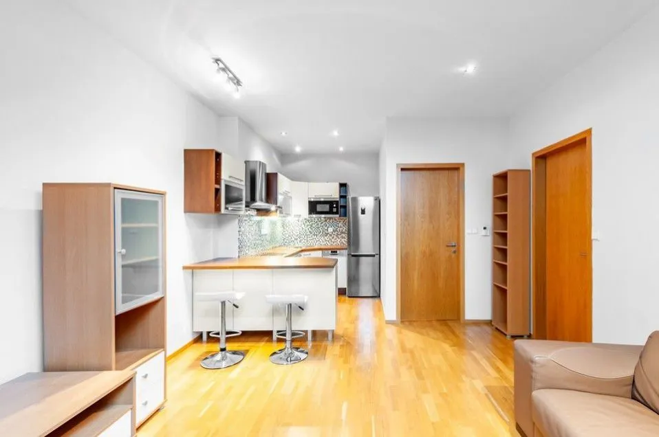 Příjemný, kompletně vybavený byt 2+kk k pronájmu s parkovacím místem a sklepem v ceně nájmu, umístěný ve 3. podlaží rezidenčního komplexu Korunní Dvůr s nonstop recepcí, ostrahou a společným upraveným vnitroblokem v oblíbené pražské čtvrti Vinohrady. Výhodná lokalita přímo u zastávky tramvaje a v pěším dosahu stanice metra Flora.