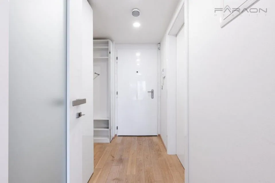 Dispozici bytu 1+kk tvoří otevřený prostor obývací části s jídelním prostorem a kuchyní v bílém lesklém designu v kombinaci s dřevem, s působivými prosklenými francouzskými okny a výhledy na panorama Prahy, dále prostorná koupelna se sprchovým koutem, samostatná závěsná toaleta zvlášť, vstupní hala se zabudovanými šatními skříněmi. Veškerý nábytek je dělaný na míru, v ložnici je značková prostorná postel z masivu s kvalitní matrací. Dostatek úložných prostor je i ve sklepě, kde je na míru vybudovaný policový systém.
