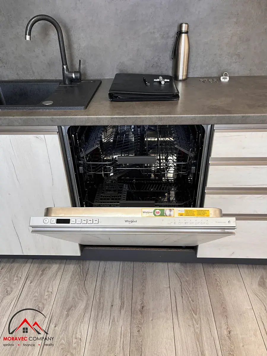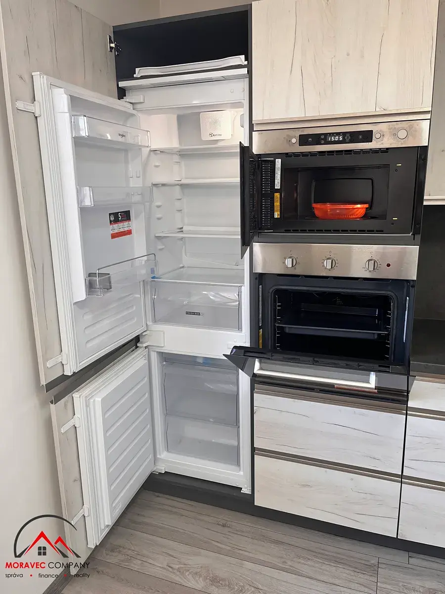 Výhodou je prostorná, moderní kuchyně. Její vybavení zahrnuje indukční varnou desku a další vestavěné spotřebiče: el. troubu, mikrovlnku, digestoř lednici a myčku, což Vám ušetří značné nálady s jejich pořizováním.