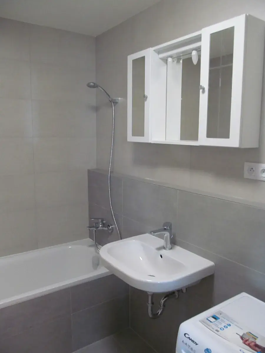 V jednotce jsou instalovány žaluzie i garníže, kompletní osvětlení, v koupelně koupelnová skříňka i pračka, v komoře praktický policový regál.