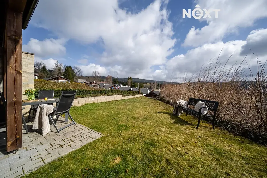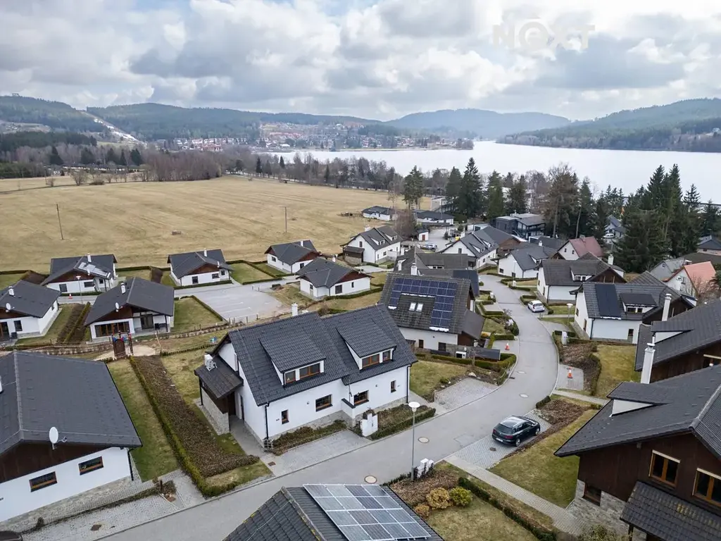 Otevřete dveře a vstoupíte na terasu orientovanou na jih. Slunce, klid a výhled. Před vámi Lipno – voda, krajina a zároveň sjezdovka, která připomíná, že tohle místo funguje dvanáct měsíců v roce. Ráno snídaně na terase, odpoledne kolo kolem jezera, v zimě lyže pár minut od domu. Tohle není marketing. Tohle je realita.