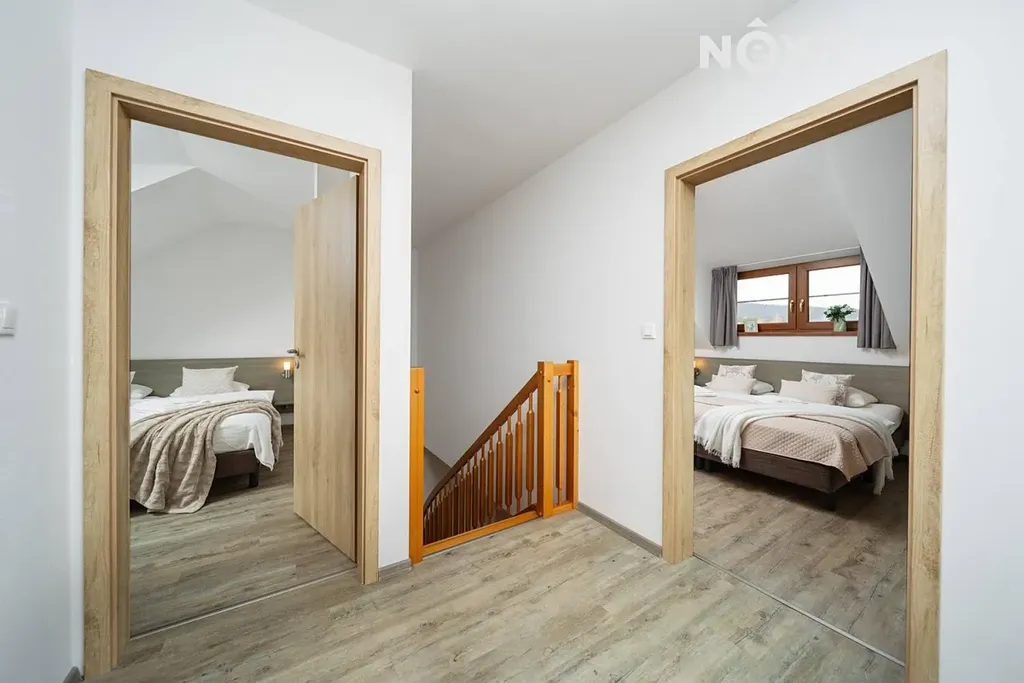 Po schodišti se přesouváme do patra, kde dům přechází do klidové zóny. Dva samostatné pokoje, které dávají flexibilitu – hlavní ložnice a další pokoj, který bez problémů pojme děti, hosty nebo další klienty v rámci krátkodobého pronájmu. Koupelna s vanou je čistá, moderní a připravená na každodenní komfort.