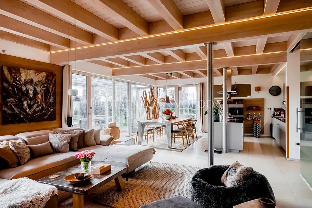 Kuchyně od renomované značky Poggenpohl je vybavena spotřebiči Miele. K posezení lákají židle u masivního ručně vyrobeného jídelního stolu nebo křeslo u krbu. Po dohodě je možné v domě veškeré interiérové vybavení včetně designových solitérů nebo originálních svítidel ponechat. Dům obklopuje zahrada, odkud lze přímo sledovat dění na golfovém hřišti. Na pozemku stojí přístřešek pro auta a dva zahradní domky.