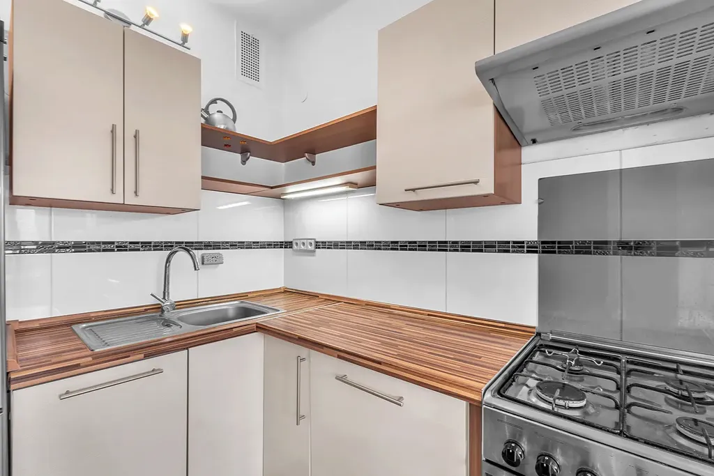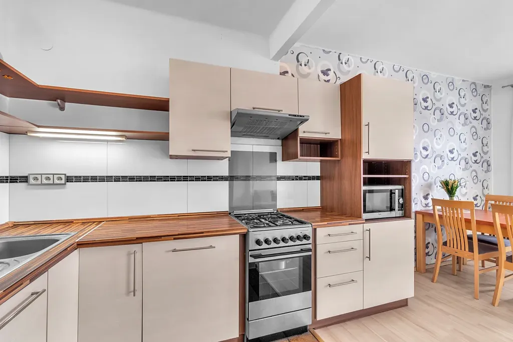 Interiér bytu tvoří velký obývací pokoj s kuchyňským koutem, který je kompletně vybaven spotřebiči – k dispozici je lednička, myčka, trouba i mikrovlnná trouba. V ložnici se nachází praktická vestavěná šatní skříň, která poskytuje dostatek úložného prostoru. Součástí bytu je dále koupelna, samostatné WC a velmi praktická komora vybavená regály. V předsíni naleznete vestavěný botník a v bytě zůstává také pračka a jídelní stůl se čtyřmi židlemi. V přízemí domu je k dispozici sklep náležící k bytu.