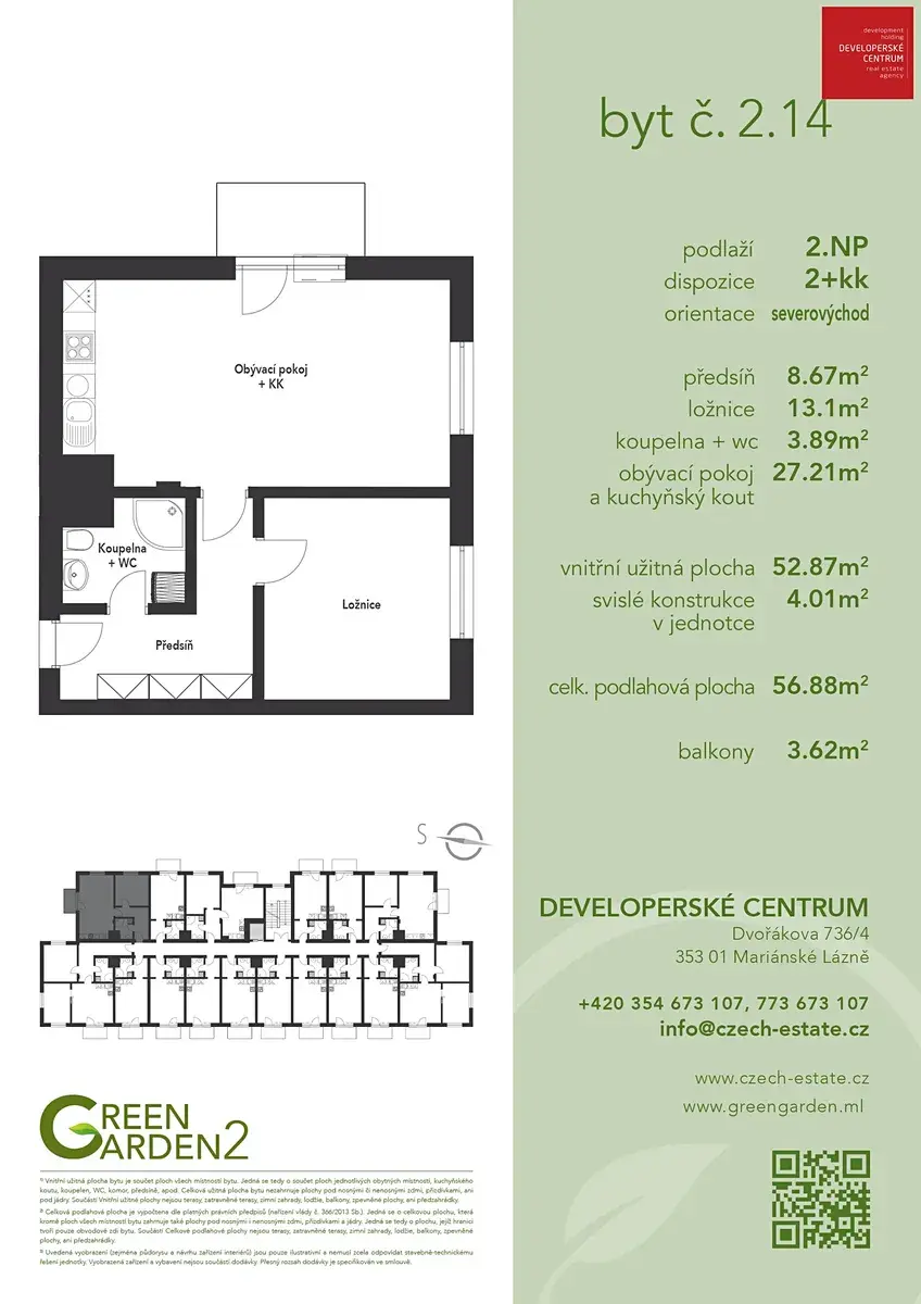 Nabízíme k pronájmu moderní a světlý byt 2+kk o velikosti 56,88 m² s balkonem o ploše 3,6 m², který se nachází ve 2. nadzemním podlaží novostavby Rezidence Green Garden 2 přímo v centru Mariánských Lázní. V domě je k dispozici výtah a celý areál je zabezpečen kamerovým systémem. Byt je orientovaný na západ a díky nadstandardní výšce stropů 2,80 m působí velmi prostorně a vzdušně. Dispozičně nabízí vstupní chodbu, koupelnu se sprchovým koutem a toaletou, samostatnou ložnici a obývací pokoj s kuchyňským koutem, ze kterého je vstup na balkon. Byt se pronajímá kompletně zařízený, včetně moderní kuchyňské linky s vestavěnými spotřebiči a kvalitního nábytku. Budova má energetickou třídu B, což zaručuje úsporné bydlení s nízkými provozními náklady. Lokalita nabízí veškerou občanskou vybavenost v docházkové vzdálenosti, zastávka MHD je přibližně 400 metrů od domu. V blízkosti se nachází supermarkety Lidl, Tesco, Penny a Kaufland, dále lékárna, obchody, kavárny, pekárny, fitness centrum i služby jako automyčka, autoservis nebo čerpací stanice. Jedná se o velmi atraktivní lokalitu s výbornou dostupností do centra i na hlavní výjezdy z města. Měsíční zálohy na služby činí 3 500 Kč pro dvě osoby, elektřina se hradí zvlášť dle skutečné spotřeby a kauce odpovídá jednomu měsíčnímu nájmu včetně záloh.
