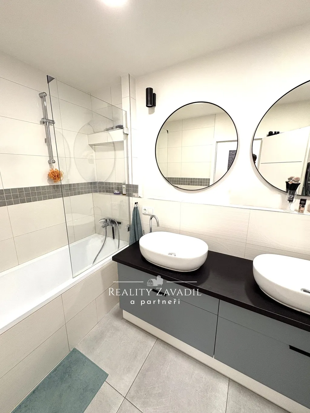 Koupelna je navržena s důrazem na komfort – nabízí dvě umyvadla, vanu a prostor pro pračku i sušičku.