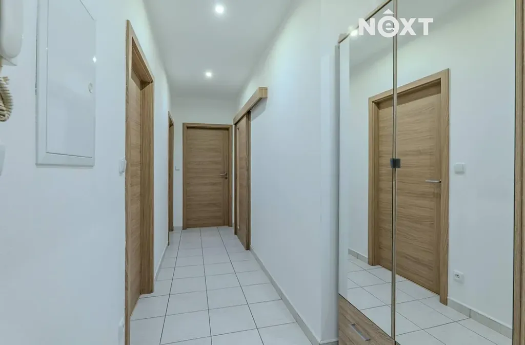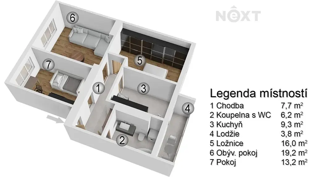 K dispozici je chodba (7,7 m2), obývací pokoj (19,2 m2), dvě ložnice (16 m2 a 13,2 m2), kuchyně (9,3 m2), koupelna s vanou a WC (6,2 m2), lodžie (3,8 m2). Kuchyňská linka je designově sladěná a plně vybavená vč. spotřebičů. Z kuchyně je přímý vstup na lodžii, kterou si můžete nechat zasklít. K bytu navíc náleží sklep s možností případného předělání na pracovnu či dílnu.