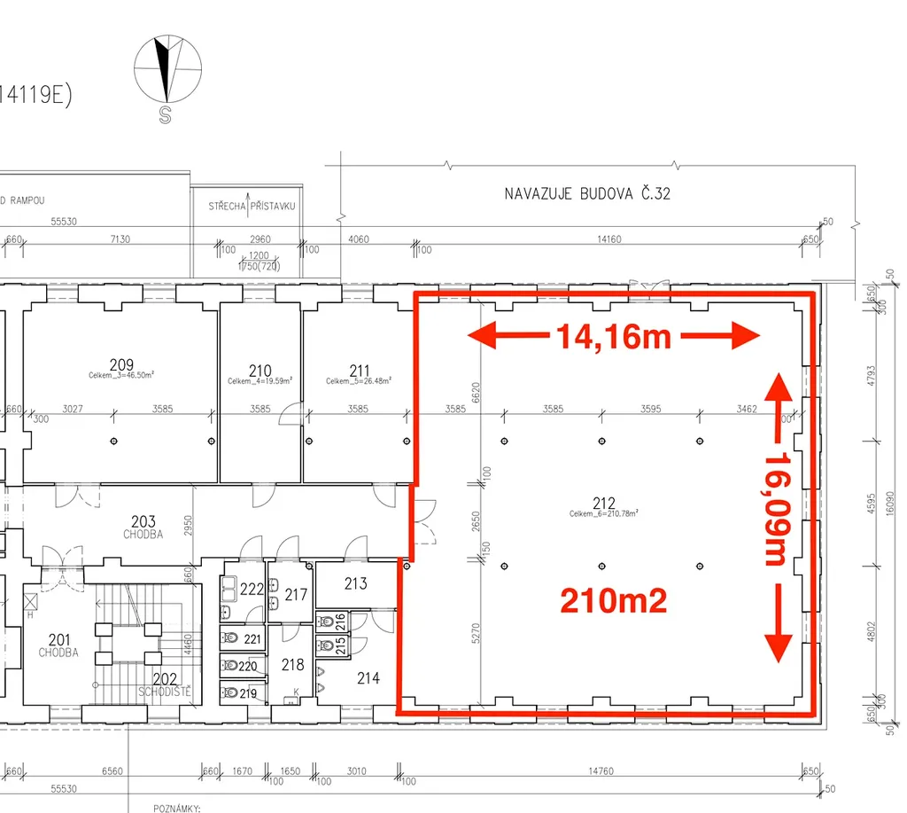 Předmětem pronájmu je nebytový prostor čtvercového tvaru 210m2 (14,65m x 16,09m) + sociální zázemí. V místnosti se nachází vyšší stropy cca 3,2m. Přístup je po schodišti nebo nákladním výtahem. K dispozici může být taky WC v případě potřeby. Prostor je vytápěný. Samostatné měření spotřeby elektrické energie.