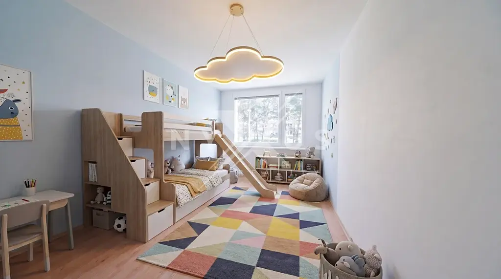 Rodinný byt 3 + 1, 70 m2, s lodžií 7 m2 a sklepem 1,5 m2 leží v 2. podlaží zatepleného panelového domu, který je situován u parku se vzrostlými stromy a leží pět minut pěšky od stanice metra Stodůlky.