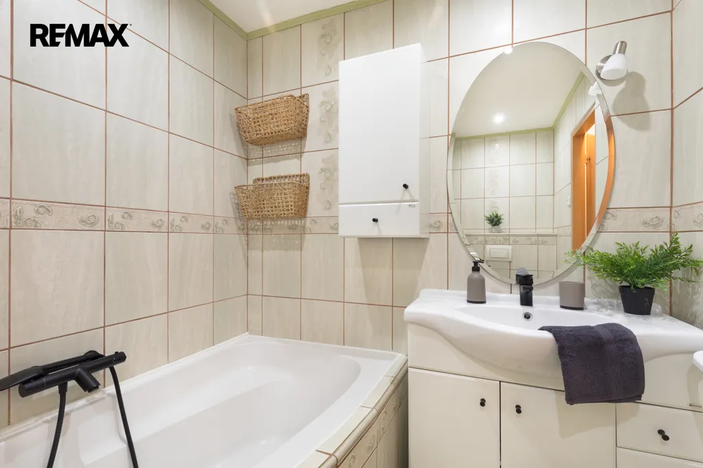 ✅ Koupelna zděná, béžové obklady, podélná vana, umývadlová skříňka, nové černé baterie, ve vaně termostatická baterie