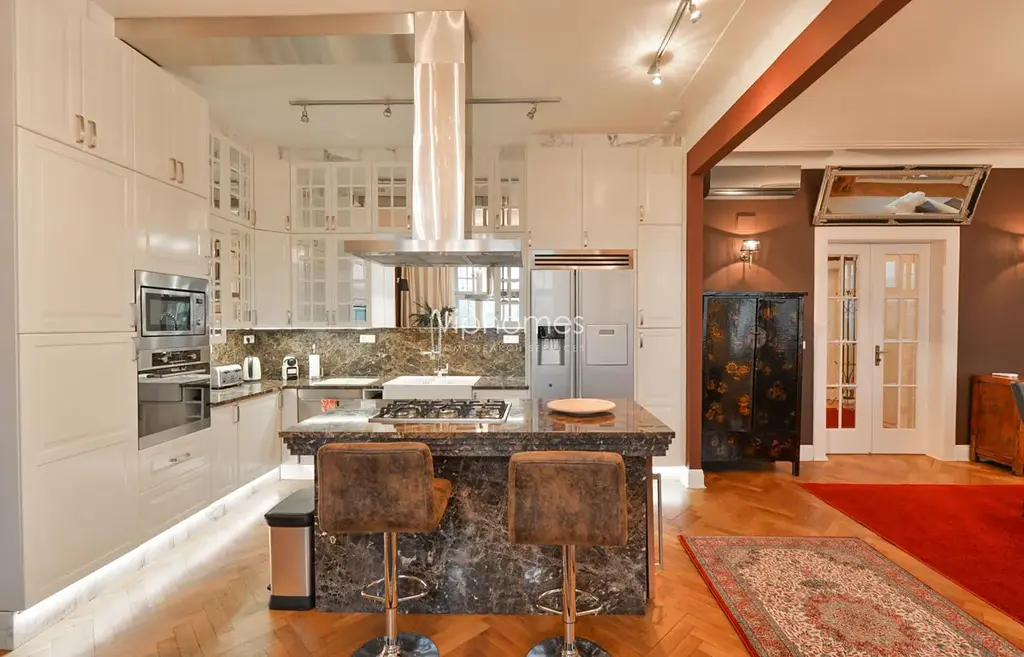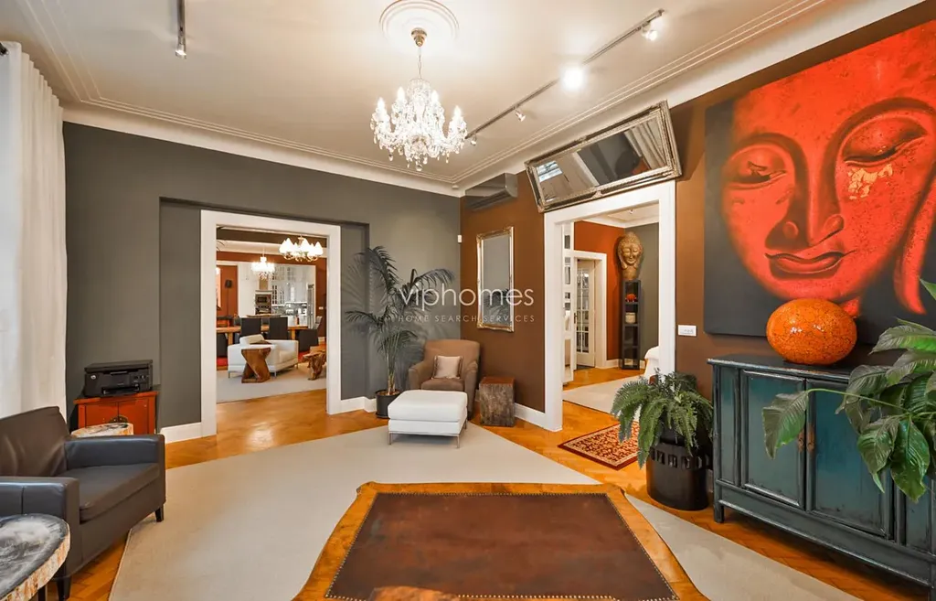 Společenské zázemí bytu tvoří dva průchozí obývací pokoje členěné na několik komfortních zákoutí. Součástí bytu je dále plně vybavená kuchyň s jídelnou, pracovna, ložnice s koupelnou, druhá koupelna a šatna. Balkon 2 m2 do klidného vnitrobloku. Interiér bytu okouzlí nadčasovou elegancí designu, pozornost přitahují kvalitní materiály, koberce, obrazy. Parketové podlahy, mramorové koupelny, alarm. Poplatky za domovní služby 6000 Kč / měs. Energie (15 000 CZK) budou převedeny na nájemce, případně platba zálohově 15 000 Kč / měsíc. Parkování v modré zóně.
