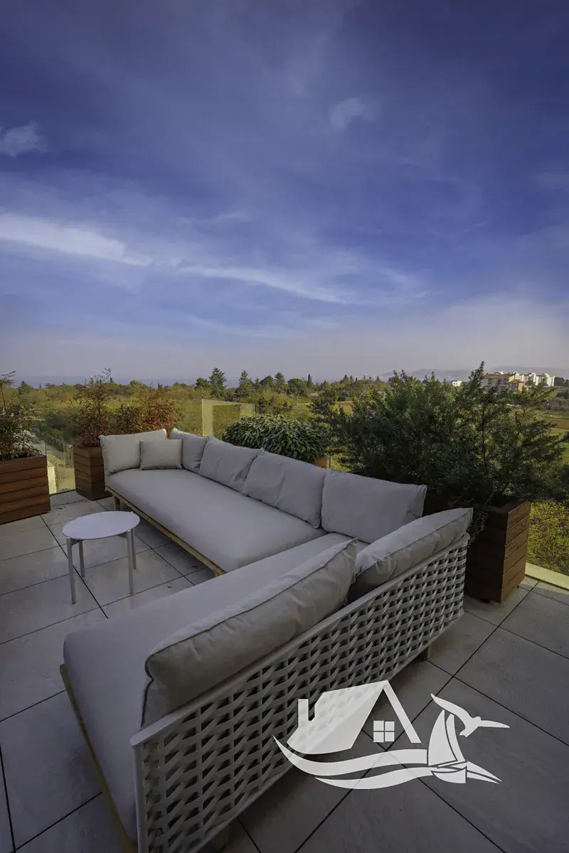 Horní patro tvoří otevřený obytný prostor s kuchyní, jídelnou a obývacím pokojem, který je díky velkoformátovým oknům zaplaven přirozeným světlem. Součástí je samostatná toaleta a dvě terasy, jedna krytá a druhá otevřená, nabízející panoramatický výhled na moře. Tento prostor je přirozeným centrem domu pro společné chvíle, setkávání i relaxaci.