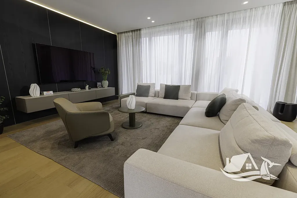 Interiér je kompletně vybaven kvalitním moderním nábytkem, s důrazem na detail, funkčnost a harmonii s okolní přírodou. Každý prvek byl zvolen tak, aby podporoval komfortní a klidné bydlení v nadstandardní kvalitě.