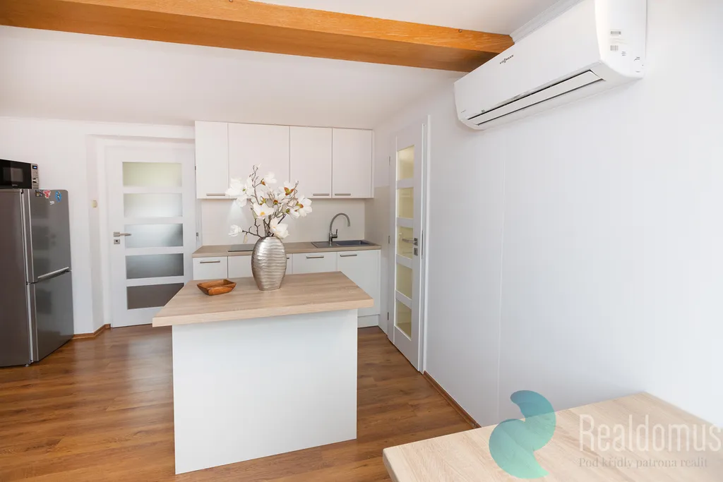 Realdomus zprostředkuje pronájem bytu v patře rodinného domu v klidné části Českého Brodu, v ulici Ruská. Tento rohový cihlový dům nabízí 2+kk o velikosti 50 m2 s terasou 19 m2. Dům je zateplený s plastovými okny se sítěmi. Vytápění plynem. Nainstalovaná i klimatizace na horké letní dny. Moderní interiér bytu zahrnuje vstupní chodbu, koupelnu se sprchovým koutem a WC, ložnici s velkou vestavnou skříní. Manželskou postelí. Kuchyň je plně vybavena, včetně myčky nádobí, pračky se sušičkou, elektrická varná deska a elektrická trouba, lednice s mrazákem. Nechybí ani mikrovlnná trouba.