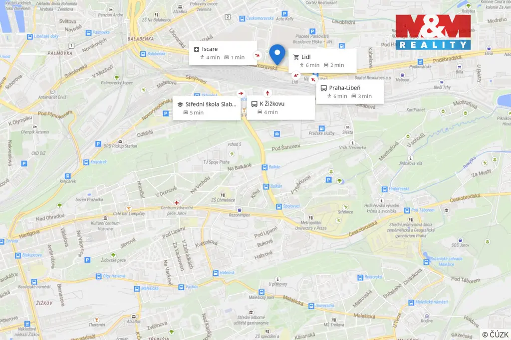 Perfektní dostupnost: metro Metro Českomoravská v docházce, tramvaj u domu a vlaková stanice Praha Libeň pár minut chůze. V blízkosti také Park Podviní pro sport i odpočinek.