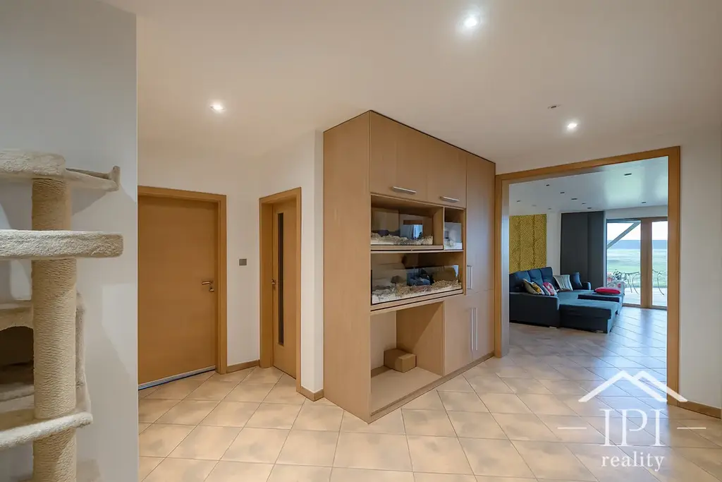 Technické zázemí tvoří prostorná dvojgaráž s přímým vstupem do domu, což je velkou výhodou zejména v nepříznivém počasí. Dále je zde technická místnost, sklad, šatna a široká chodba s dostatkem úložných prostor. Dům je vybaven dvou zónovým zabezpečovacím systémem.