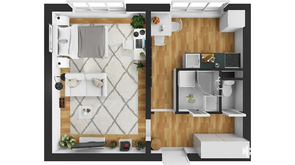 Interiér bytu zahrnuje prostorný obývací pokoj, samostatnou kuchyň, koupelnu se sprchovým koutem a oddělenou toaletou. Prostor je dobře využit a poskytuje dostatek místa pro uspořádání podle vašich představ. K bytu náleží také sklepní kóje, což je ideální pro uložení sezónních věcí nebo sportovního vybavení. Měsíční náklady spojené s provozem bytu činí 3.735,-Kč + spotřeba el.energie.
