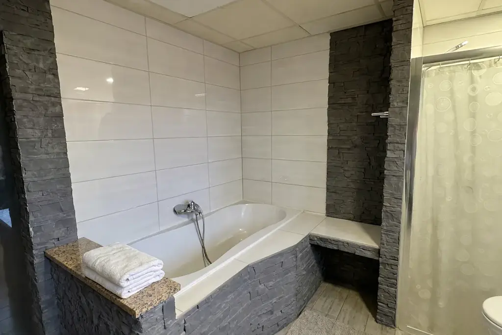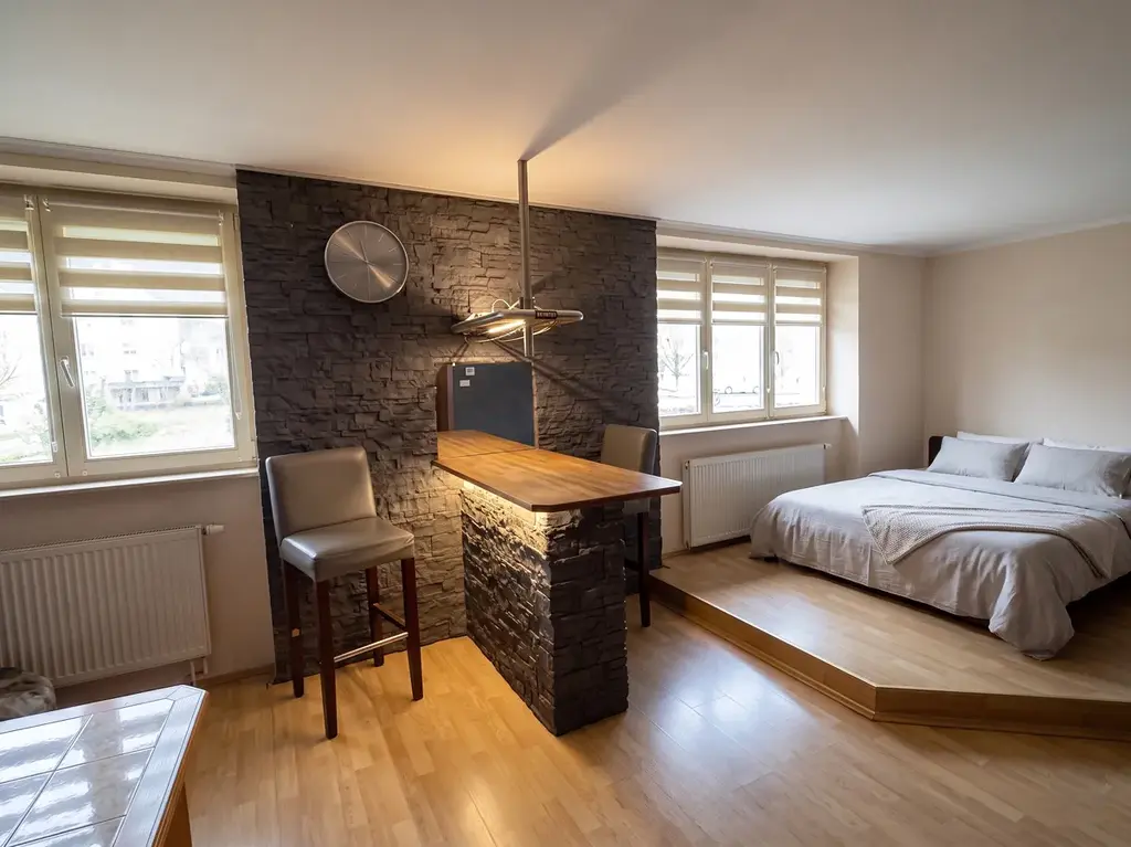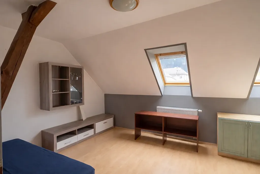 V první úrovni bytu se nachází předsíň, obývací pokoj plynule propojený s ložnicí, prostorná kuchyně s novou linkou a moderně řešená koupelna, která disponuje vanou i sprchovým koutem. Celkový dohled na detail podtrhují vkusné dekorativní obklady a nově realizované povrchy stěn a podlah.