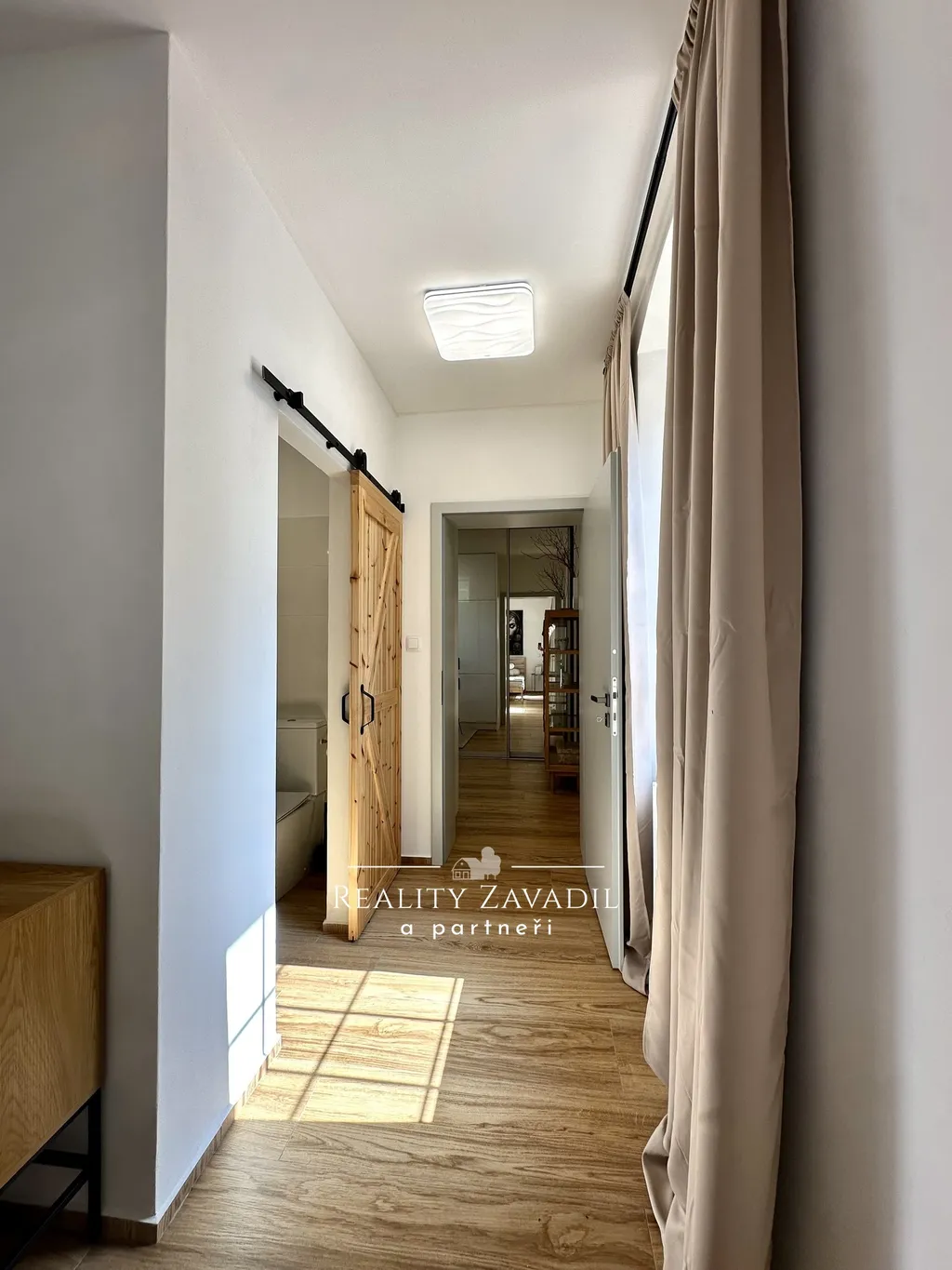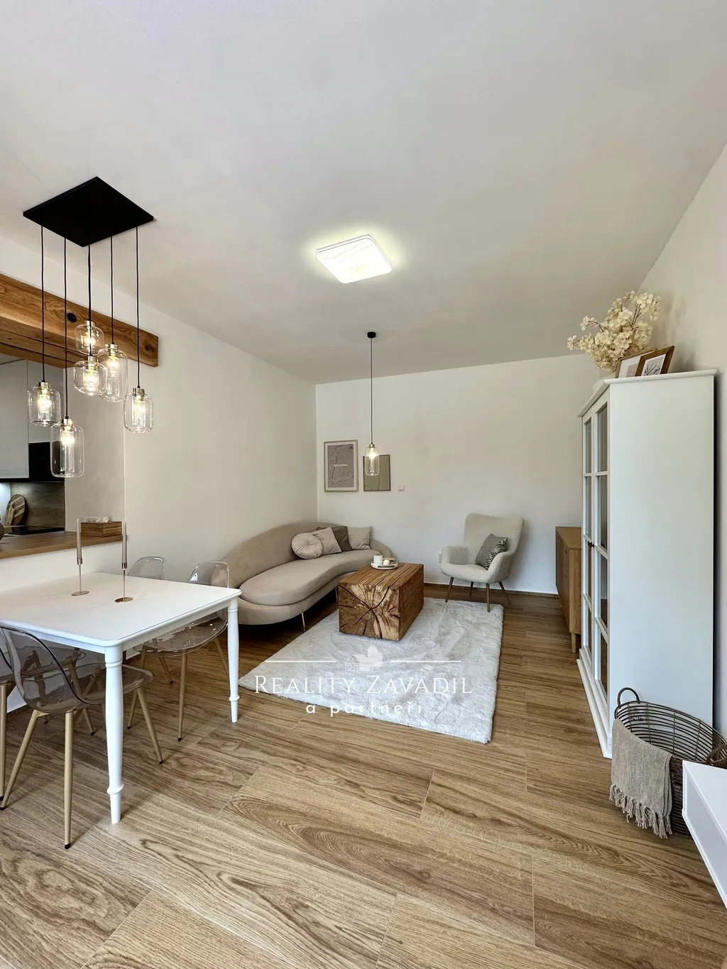 Interiér bytu je navržen v moderním skandinávském stylu s důrazem na kvalitu materiálů a praktické využití prostoru. Obytná část plynule propojuje obývací pokoj s jídelnou a kuchyňským koutem, který je kompletně osazen vestavnými spotřebiči. Prostoru dominují designové prvky v podobě přiznaných stropních trámů a masivních posuvných dveří. Ložnice je vybavena manželskou postelí a dostatečnými úložnými prostory. Koupelna disponuje velkoformátovým sprchovým koutem a moderní sanitární keramikou. Byt se prodává s veškerým zobrazeným vybavením a nevyžaduje žádné další počáteční investice.