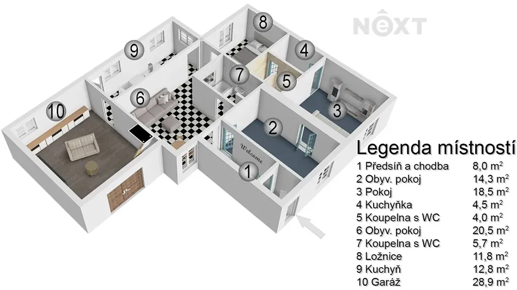 * druhá bytová jednotka 2+1: obývací pokoj (20,5 m2), koupelna s WC (5,7 m2), ložnice (11,8 m2), kuchyně (12,8 m2) Dále je k dispozici společná předsíň a chodba (8 m2), garáž (28,9 m2) a sklep.