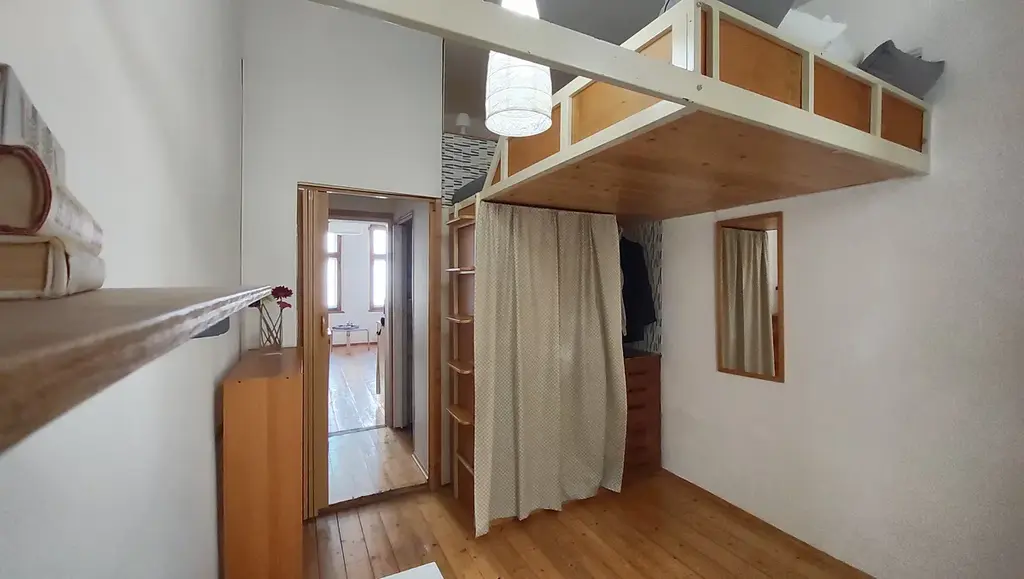 I offer nice two piece appartment - the rooms are separate - kitchinette in the living room, high sleeping in the bedroom (bedroom is facing quiet yard). Toiled is in the bathroom. Washing machine and dishwasher in the kitchinette.Heating by electric heaters, very old wooden floor (needs gentle care), furniture as on the photos. Second floor, no lift. For two people maximum.