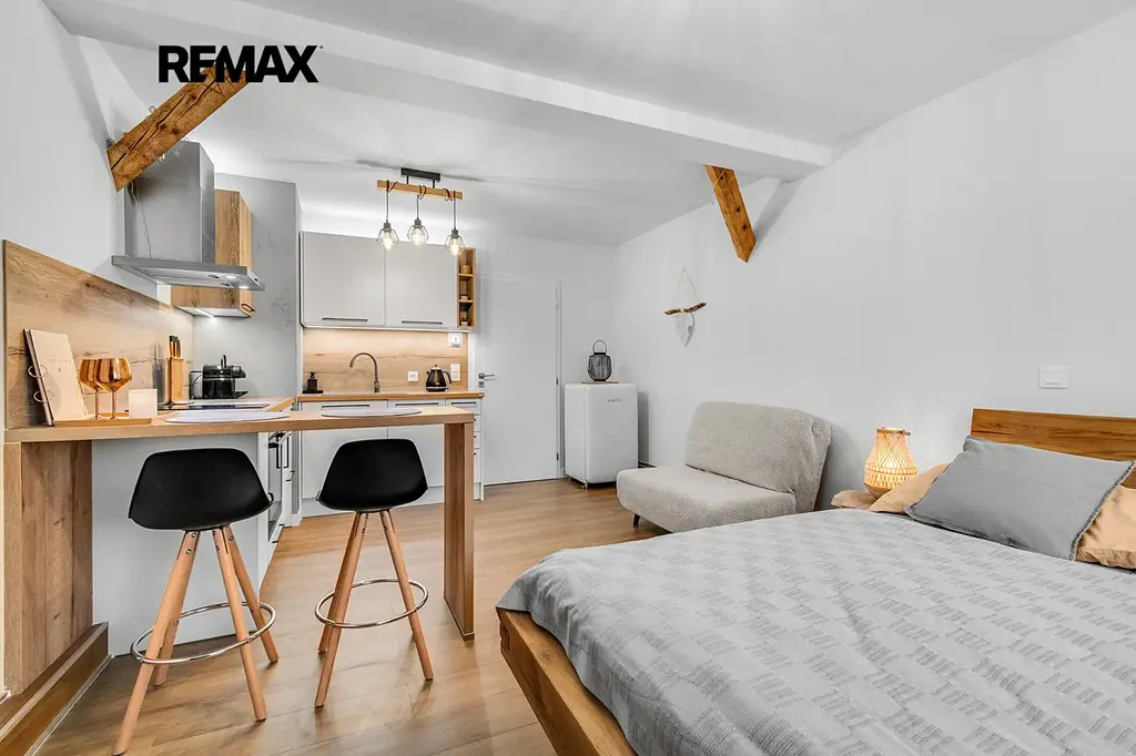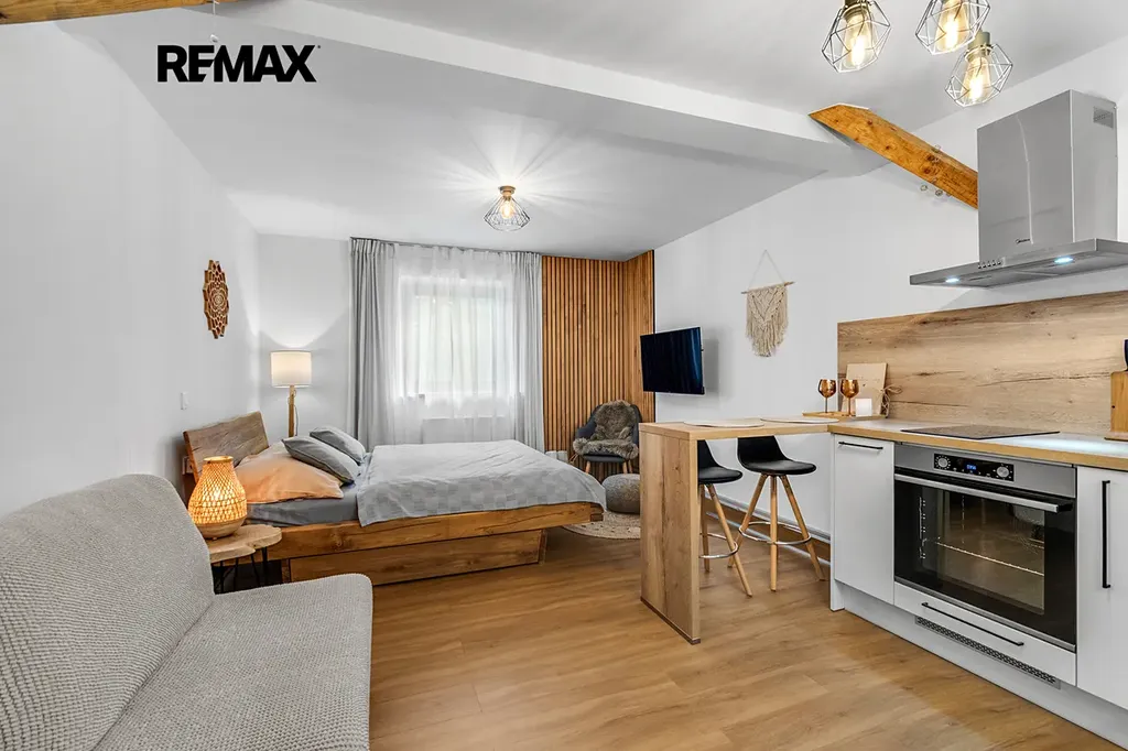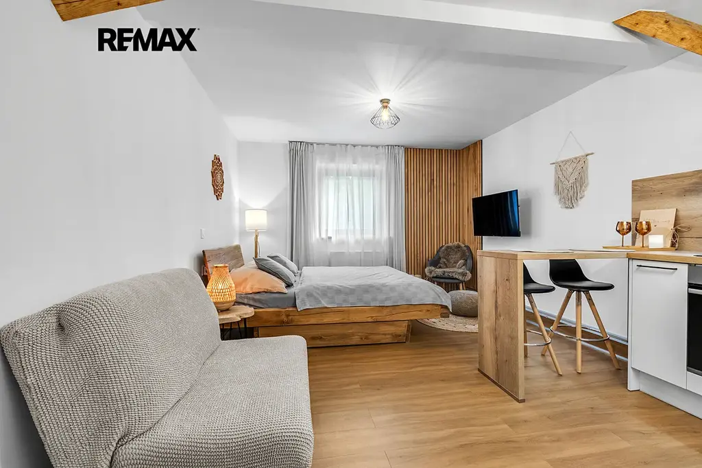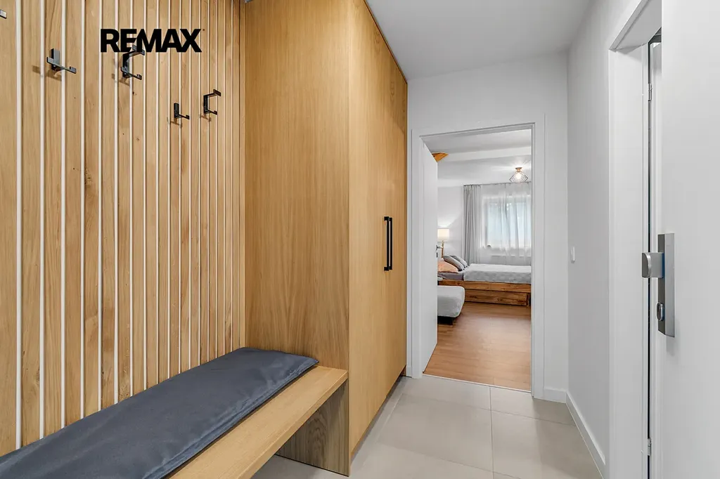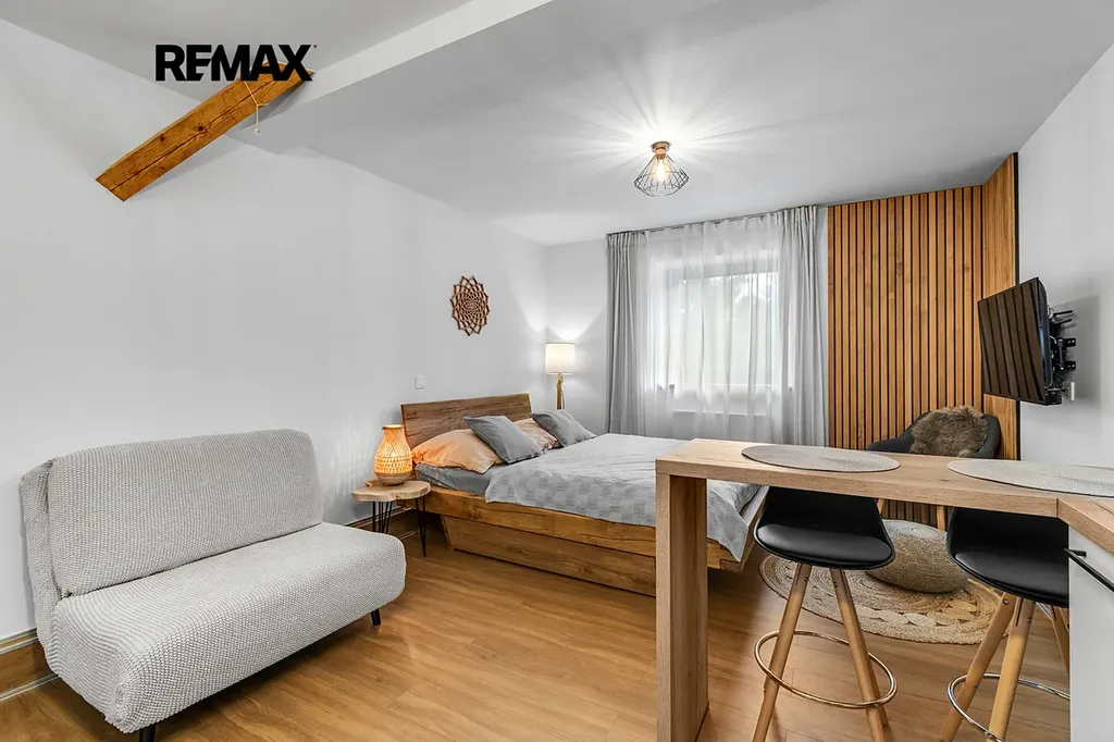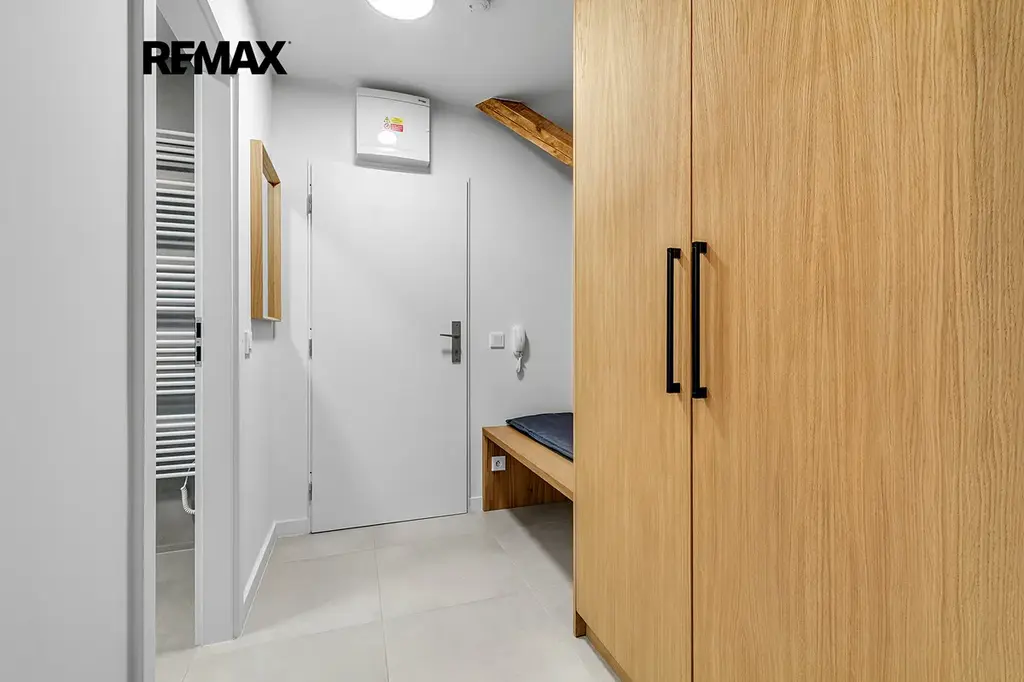 Interiér je řešen velmi prakticky a zároveň stylově – k dispozici je vstupní předsíň s vestavěnou skříní a dřevěnou šatní stěnou, moderní koupelna se sprchovým koutem a toaletou a hlavní obytný prostor propojující obývací část, ložnici a kuchyňský kout. Samozřejmostí je kompletní vybavení, díky kterému je apartmán připraven k okamžitému užívání i pronájmu.