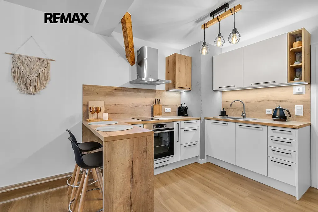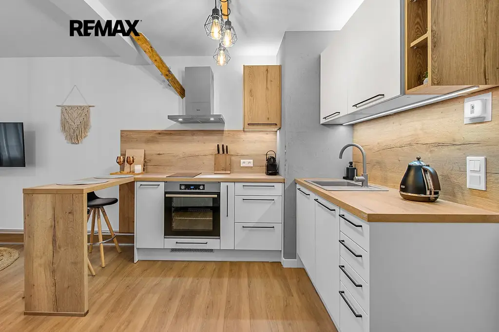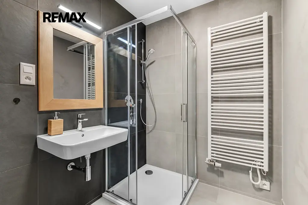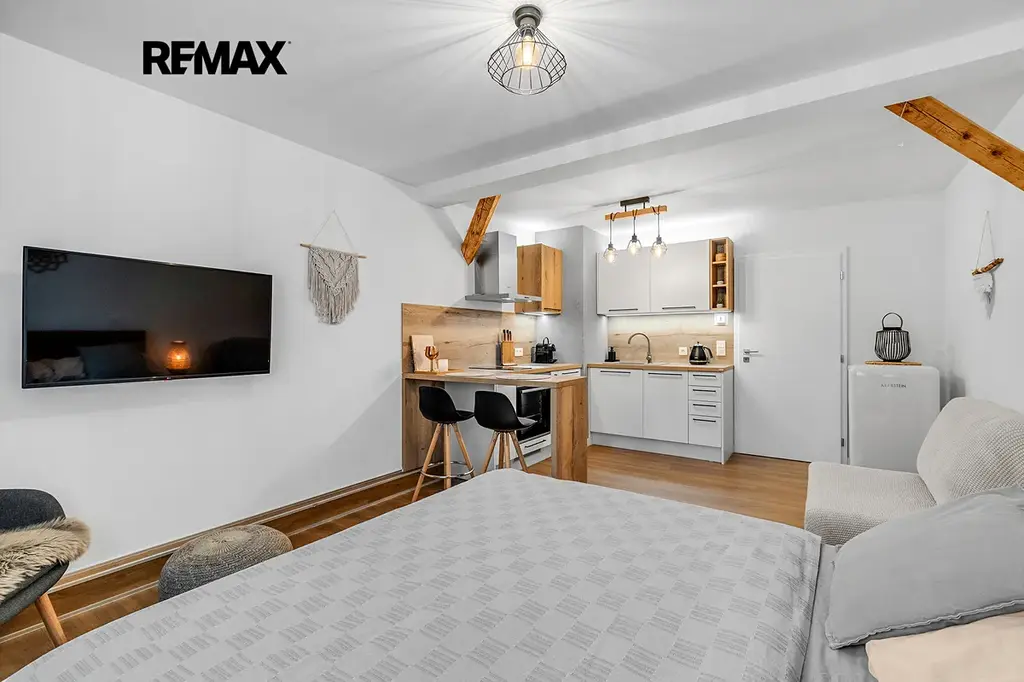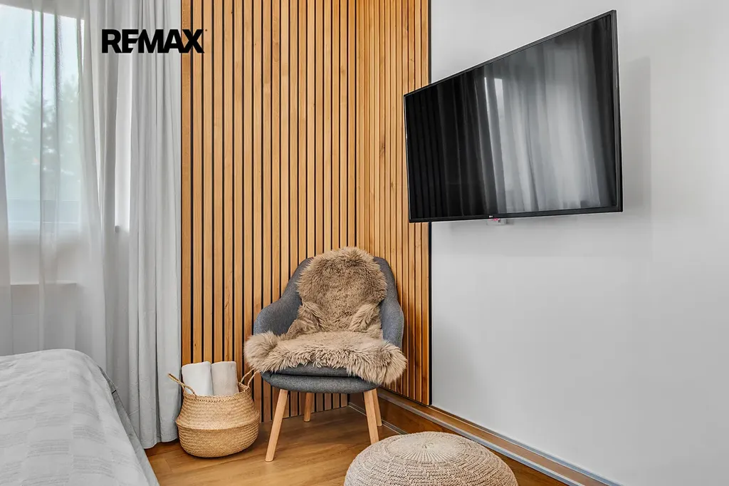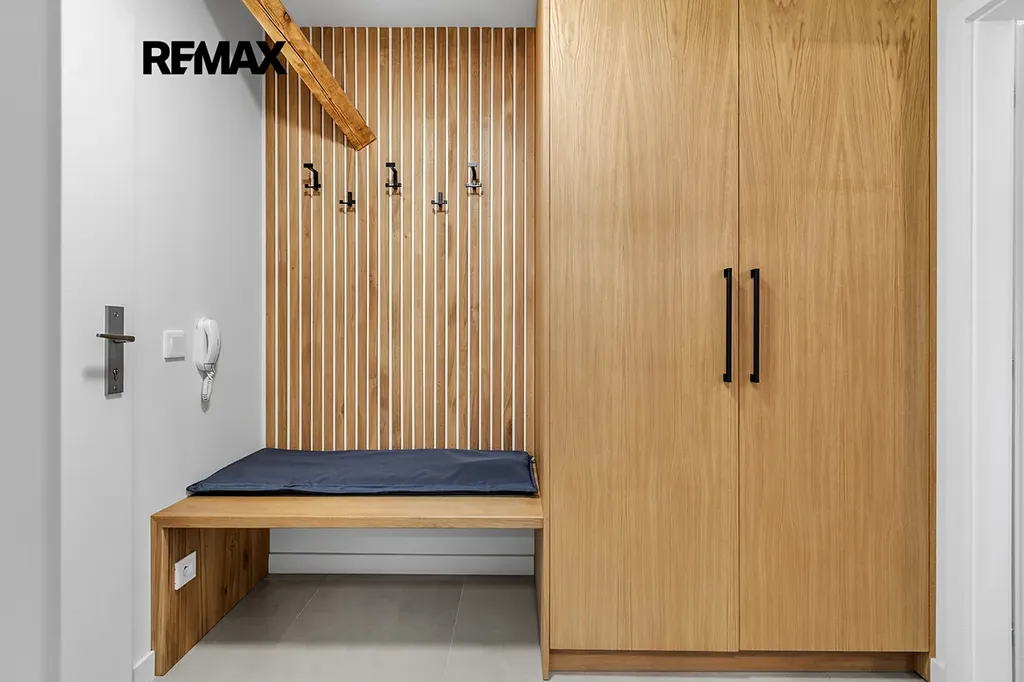 Interiér je řešen velmi prakticky a zároveň stylově – k dispozici je vstupní předsíň s vestavěnou skříní a dřevěnou šatní stěnou, moderní koupelna se sprchovým koutem a toaletou a hlavní obytný prostor propojující obývací část, ložnici a kuchyňský kout. Samozřejmostí je kompletní vybavení, díky kterému je apartmán připraven k okamžitému užívání i pronájmu.